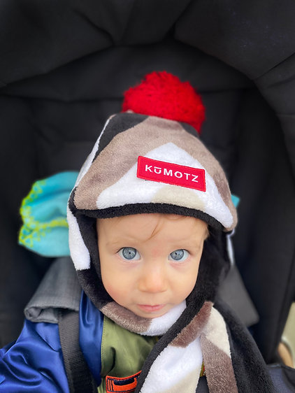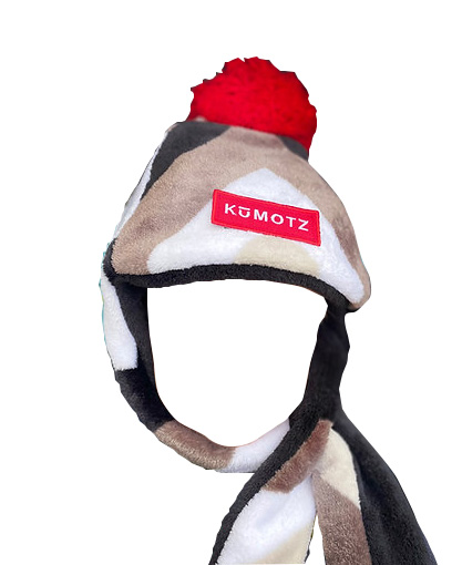 Căciulă-fular din material moale și călduros, cu pompon roșu și etichetă brodată cu slogan HaiKūMOTZ ™.