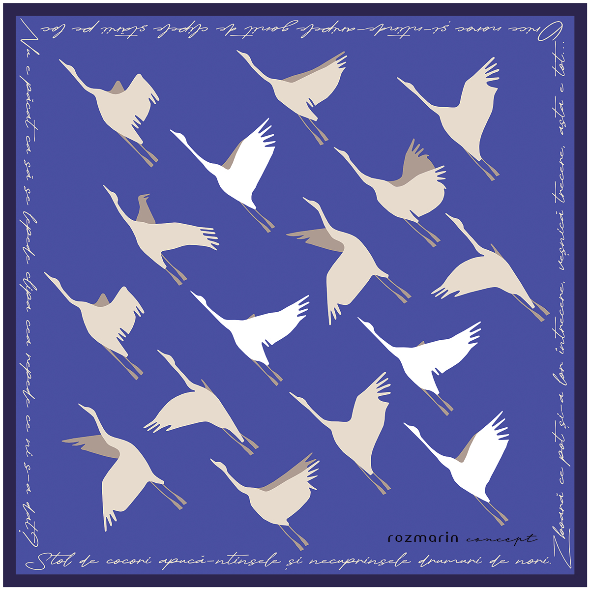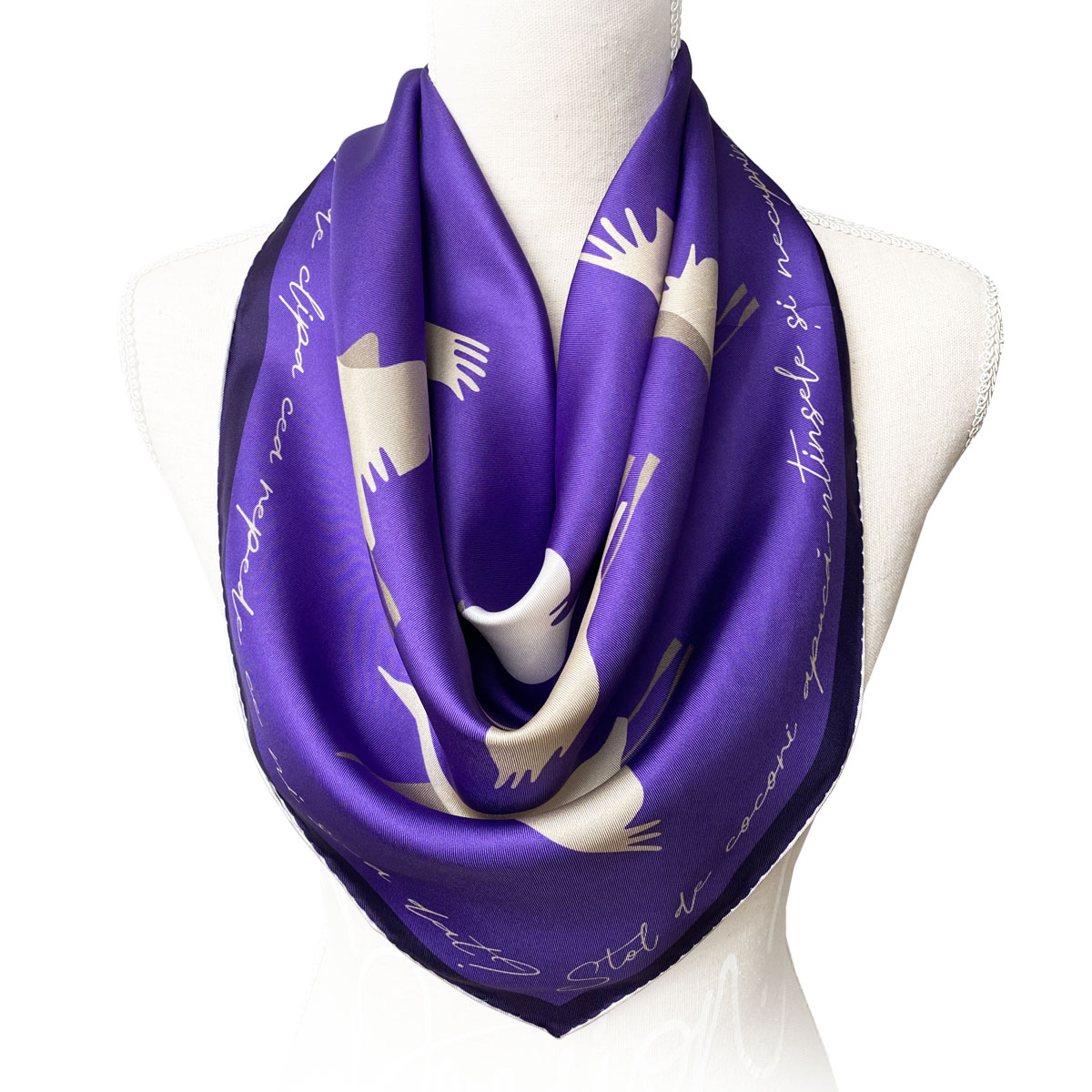 O eșarfă care te îmbracă în culoare și poezie. Pe marginea eșarfei sunt câteva versuri de M. Eminescu.
