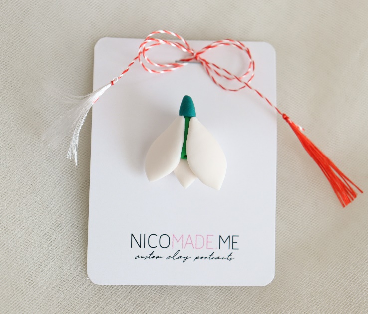 Martisor de tip Brosa, lucrat manual din lut polimeric si cu prindere de tip ac de brosa din otel inoxidabil.