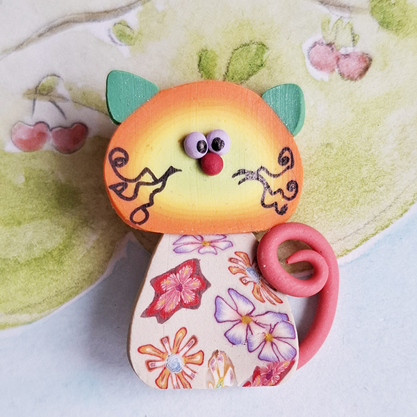 Mărțișor - broșă, realizat manual din pastă polimerică ( fimo ) folosind tehnica "millefiori", legat cu șnur și ambalat în plic transparent. Mărțișoarelele fiind realizate manual în serie mică, pot să apară mici variații de nuanță, formă și dimensiune.