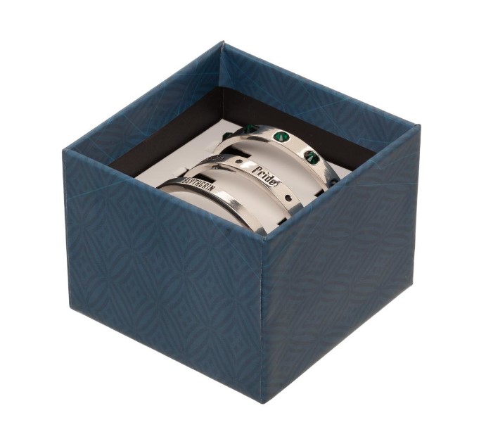 O bratara gravata cu "Cunning, Ambition, Pride, Determination", trasaturile casei Slytherin