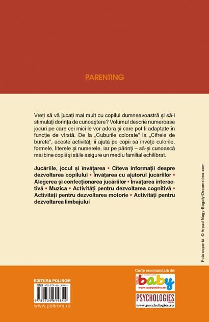 Vreti sa va jucati mai mult cu copilul dumneavoastra si sa-i stimulati dorinta de cunoastere? Volumul descrie numeroase jocuri pe care cei mici le vor adora si care pot fi adaptate in functie de virsta. De la „Cuburile colorate” la „Cifrele de burete”, aceste activitati ii ajuta pe copii sa invete culorile, formele, literele si numerele, iar pe parinti – sa-si cunoasca mai bine copiii si sa le asigure un mediu familial echilibrat.