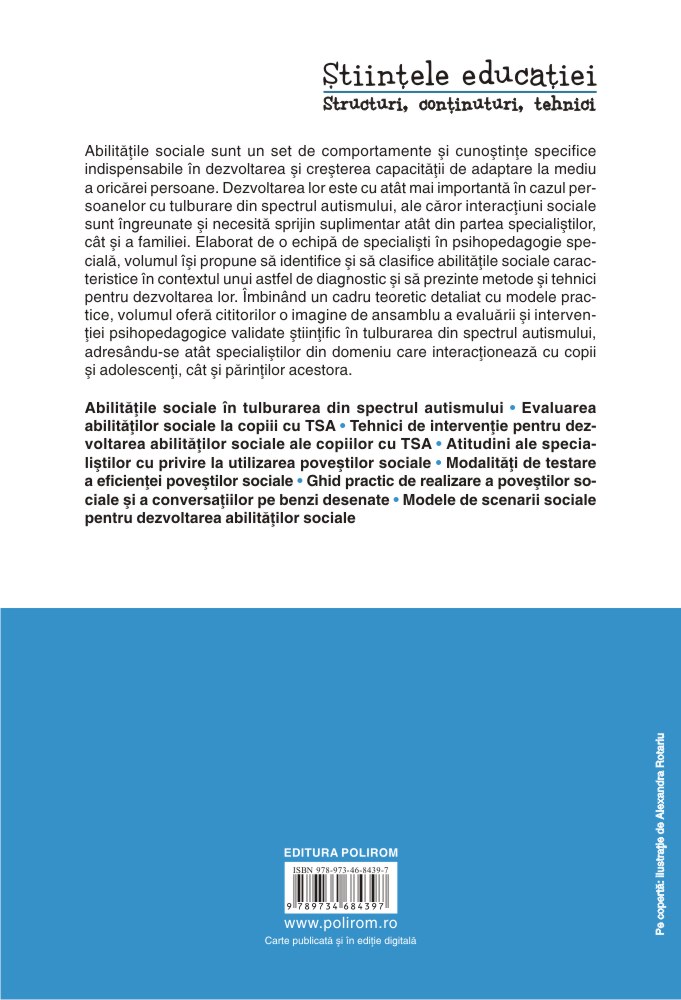Abilitățile sociale sînt un set de comportamente și cunoștințe specifice indispensabile în dezvoltarea și creșterea capacității de adaptare la mediu a oricărei persoane. Dezvoltarea lor este cu atît mai importantă în cazul persoanelor cu tulburare din spectrul autismului, ale căror interacțiuni sociale sînt îngreunate și necesită sprijin suplimentar atît din partea specialiștilor, cît și a familiei. Elaborat de o echipă de specialiști în psihopedagogie specială, volumul își propune să identifice și să clasifice abilitățile sociale caracteristice în contextul unui astfel de diagnostic și să prezinte metode și tehnici pentru dezvoltarea lor. Îmbinînd un cadru teoretic detaliat cu modele practice, volumul oferă cititorilor o imagine de ansamblu a evaluării și intervenției psihopedagogice validate științific în tulburarea din spectrul autismului, adresîndu-se atît specialiștilor din domeniu care interacționează cu copii și adolescenți, cît și părinților acestora.