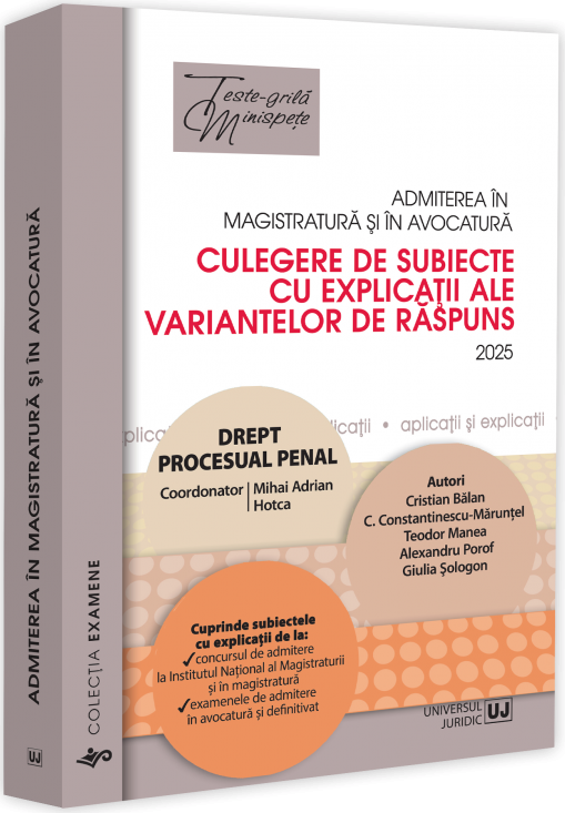 Realizata de un colectiv de autori cu mare experiența, format din judecatori și cadre didactice care predau la facultați de drept de prestigiu din țara, lucrarea Admiterea în magistratura si în avocatura. Culegere de subiecte cu explicatii ale variantelor de raspuns. Drept procesual penal este utila candidaților la examenele de admitere în profesiile juridice, pentru concursul de admitere în magistratura, pentru examenele de admitere în profesia de avocat, de definitivare sau promovare, precum și studenților facultaților de drept, pentru examenul de licența.