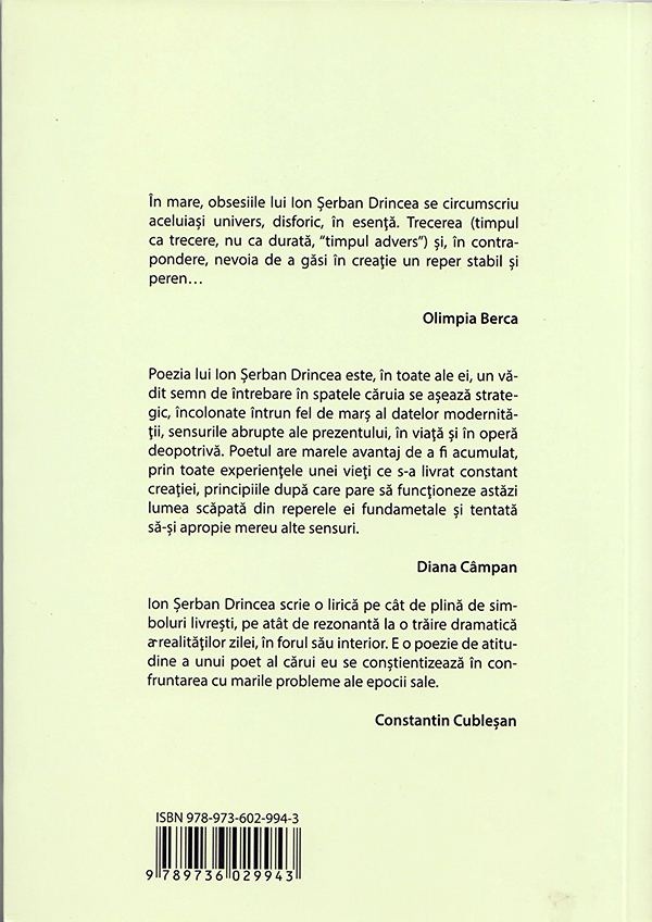 In mare, obsesiile lui Ion Serban Drincea se circumscriu aceluiasi univers, disforic, in esenta. Trecerea (timpul ca trecere, nu ca durata, "timpul advers") si, in contrapondere, nevoia de a gasi in creatie un reper stabil si peren... - Olimpia Berca