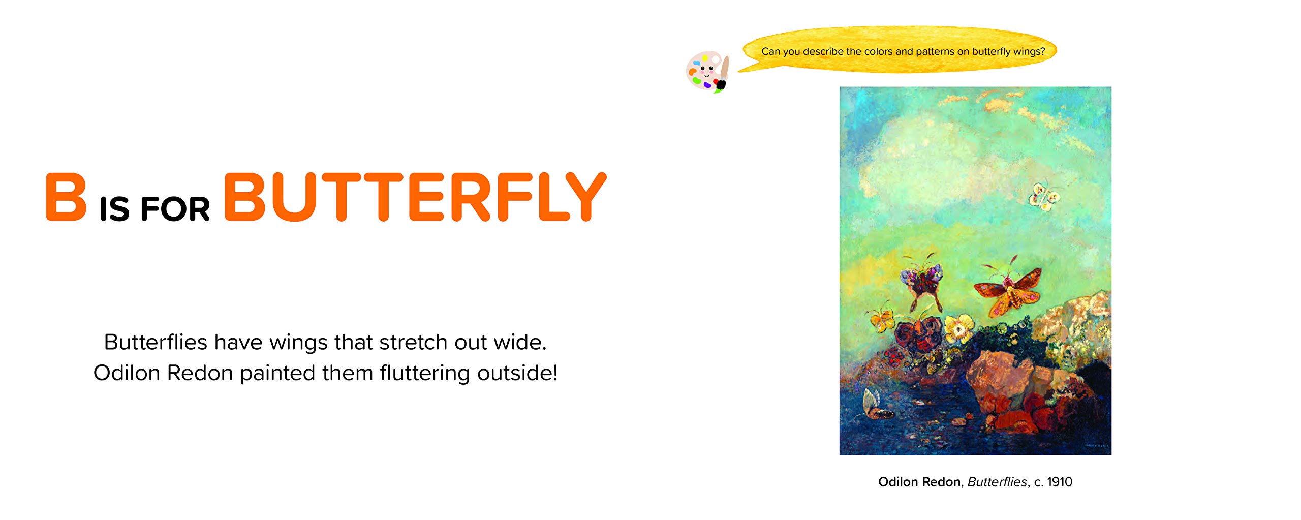 In this collection, your child will discover artwork by Vincent van Gogh, Winslow Homer, Clara Peeters, and many others. Learn about butterflies in Odilon Redon's Butterflies, purr like kittens while examining Henriette Ronner-Knip's The Cat at Play, and discuss the colors used in Franz Marc's Blue Horse I.