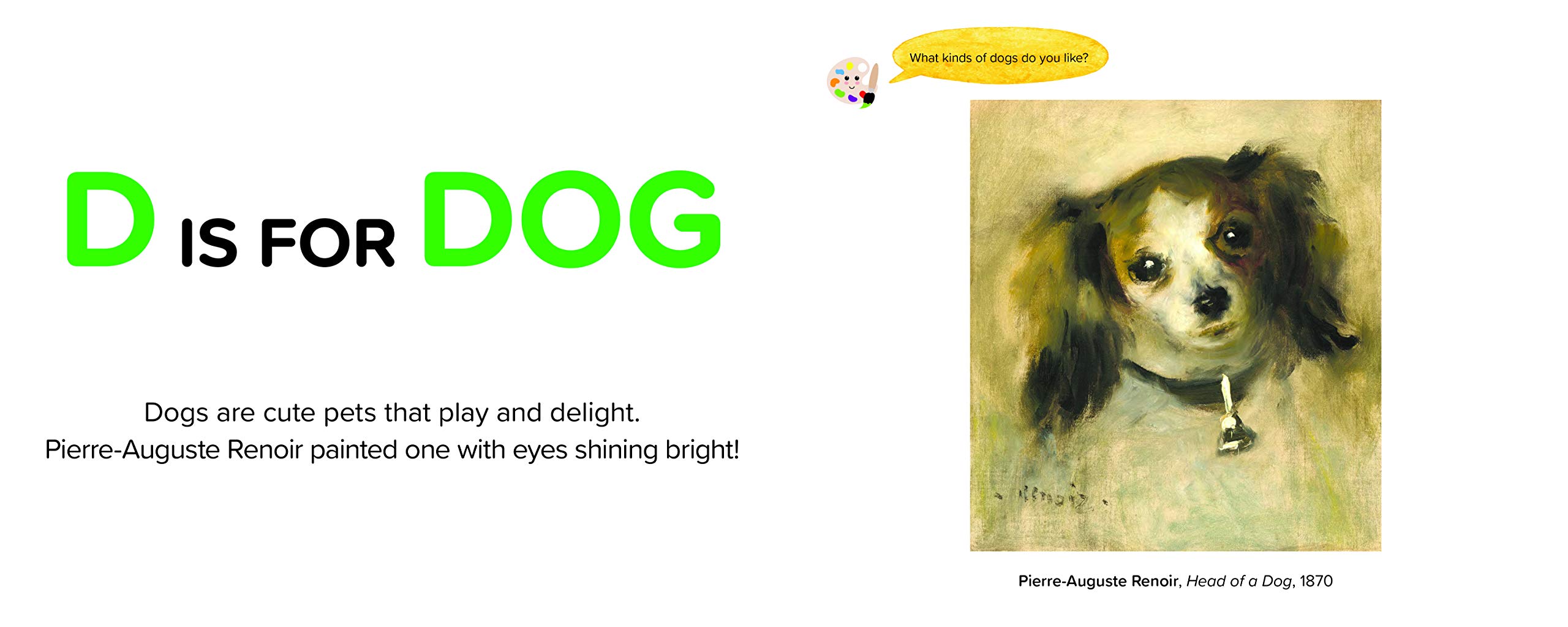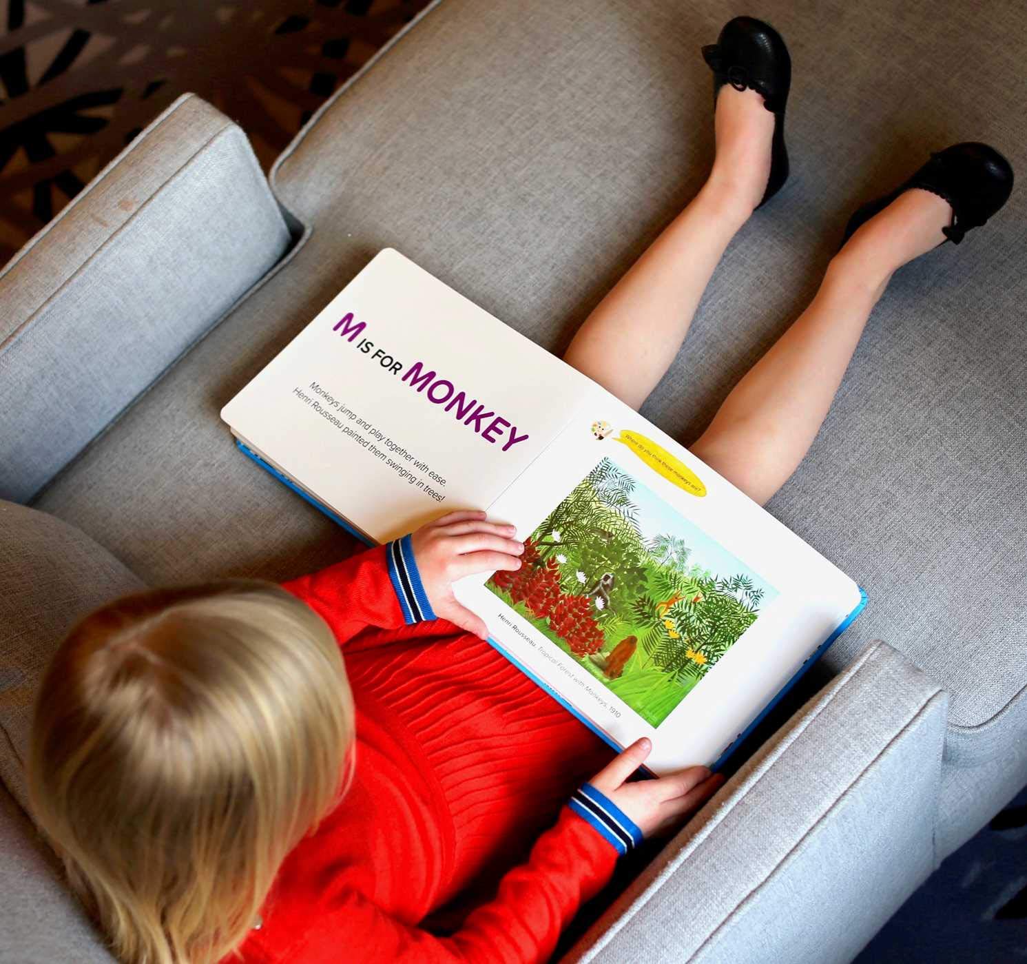 With a fun rhyming scheme and large, colorful text, Animals in Art will inspire your budding art lovers as they learn the about the alphabet, animals, and new words by finding objects in paintings. Then, as your child grows, you can read the playful poems aloud together and answer the interactive questions that accompany each painting.
