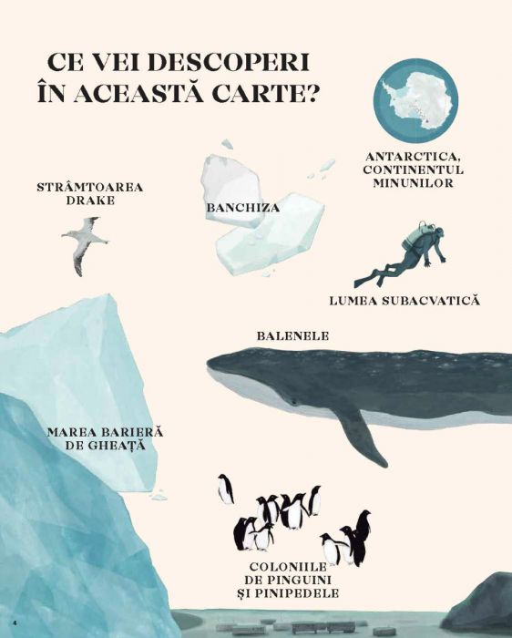 Prin intermediul acestei cărţi, vă puteți îmbarca într-o călătorie spre Polul Sud, atât pentru a descoperi minunile sale naturale, cât și pentru a afla mai multe despre activitatea oamenilor de ştiinţă, viața în bazele de cercetare de aici, povestea primilor exploratori ai acestui continent și spiritul Tratatului Antarcticii.