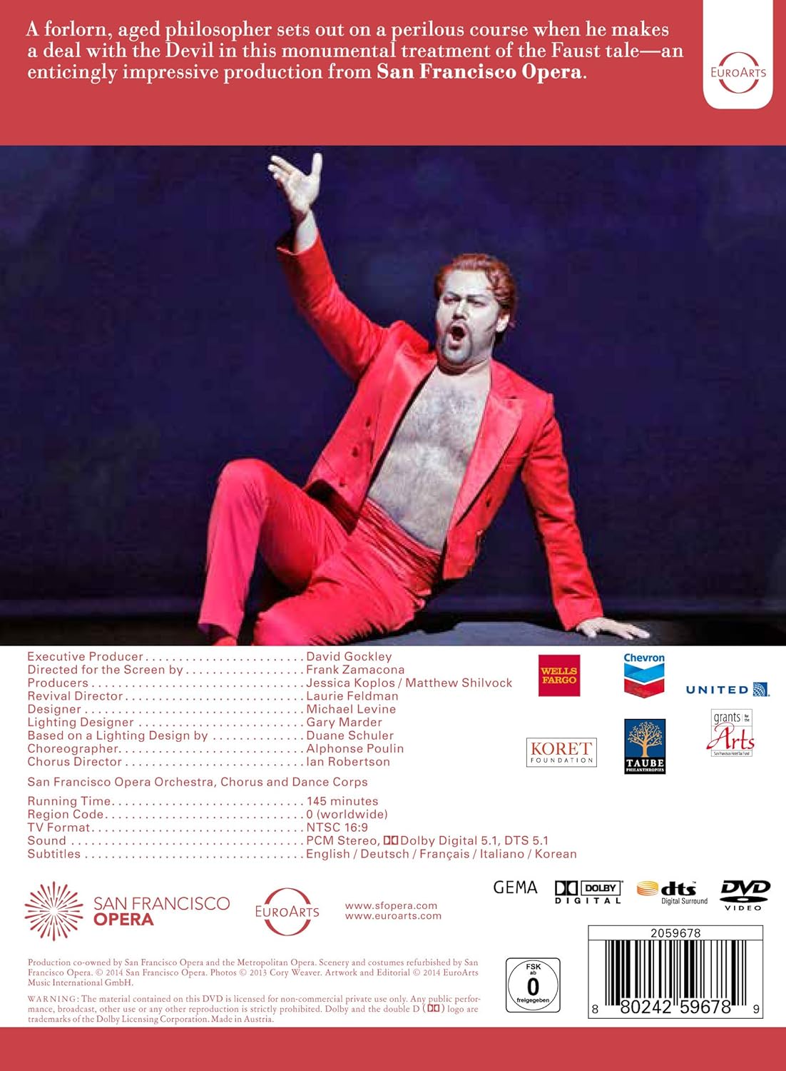The cast includes Ramon Vargas, a tenor 'in ravishing voice' (Financial Times), as the philosopher who sells his soul to the Devil the 'luminous, compelling' Patricia Racette (Washington Post) as the woman he desires and, in the vividly menacing title role, the 'seductively malevolent' bass-baritone Ildar Abdrazakov, a 'full bodied bass-baritone' renowned for his 'wonderfully evil portrayals' (The New York Times).