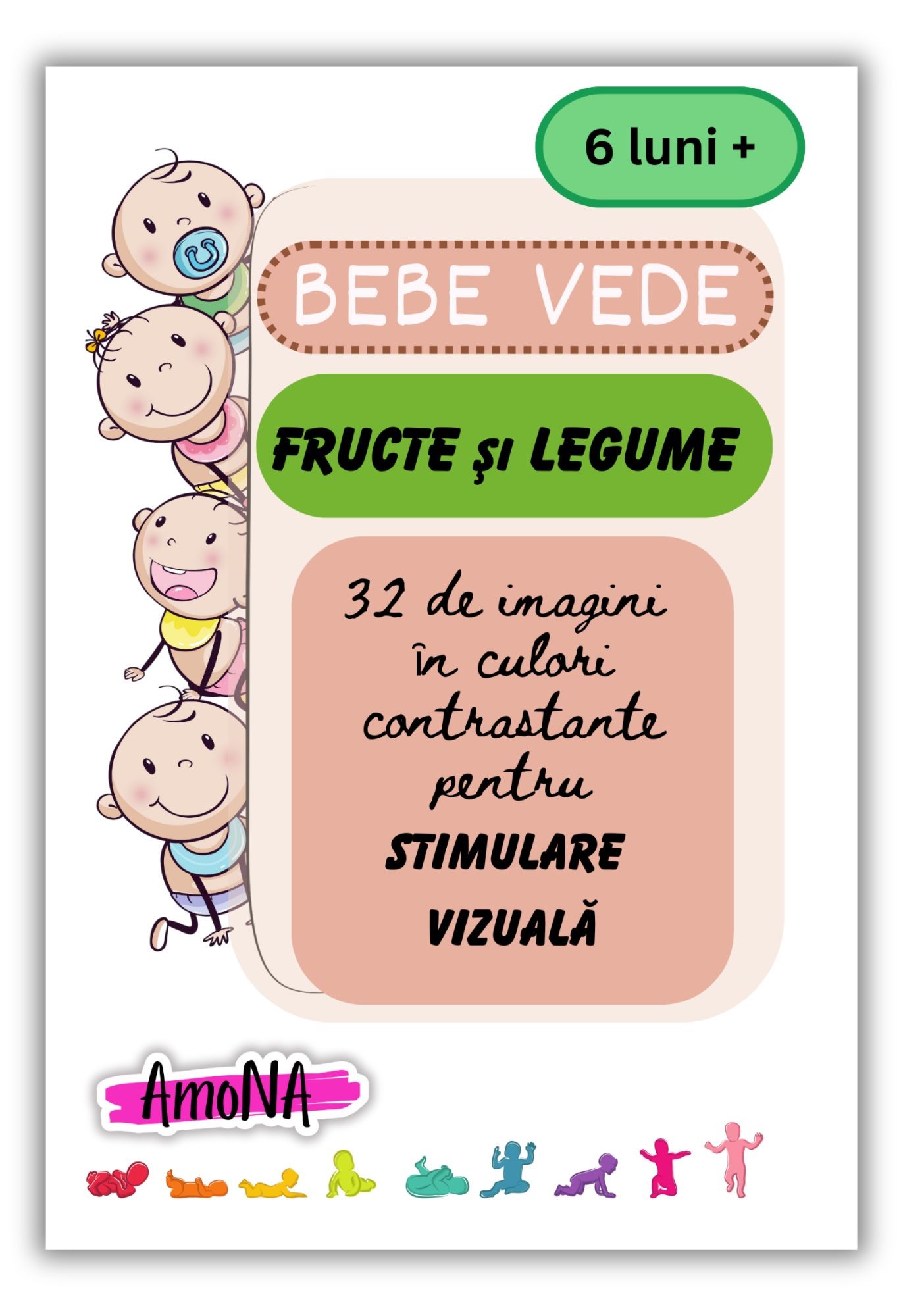 Pachetul “FRUCTE şi LEGUME” conţine 32 de imagini ȋn culori contrastante, cu fructe şi legume pe care bebeluşul le va şi gusta ȋncepȃnd cu vȃrsta de 6 luni, odată cu diversificarea alimentaţiei. De la 6 luni bebe vede tridimensional, distinge culorile, conexiunea dintre ochi şi creier se dezvoltă şi foloseşte văzul pentru a ȋnvăţa.