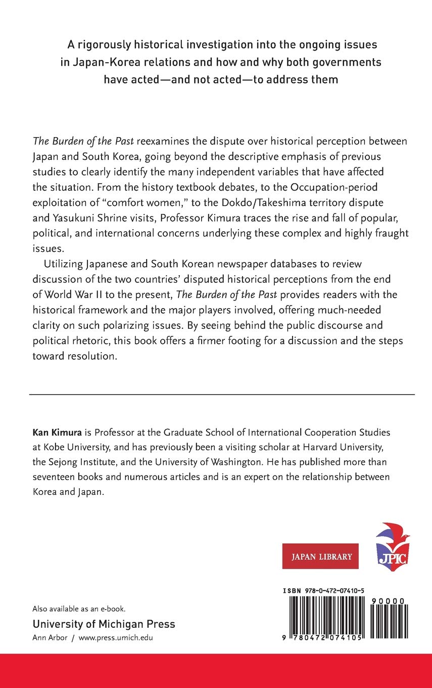 The Burden of the Past reexamines the dispute over historical perception between Japan and South Korea, going beyond the descriptive emphasis of previous studies to clearly identify the many independent variables that have affected the situation. From the history textbook debates, to the Occupation-period exploitation of "comfort women," to the Dokdo/Takeshima territory dispute and Yasukuni Shrine visits, Professor Kimura traces the rise and fall of popular, political, and international concerns underlying these complex and highly-fraught issues. Utilizing Japanese and South Korean newspaper databases to review discussion of the two countries' disputed historical perceptions from the end of World War II to the present, The Burden of the Past provides readers with the historical framework and the major players involved, offering much-needed clarity on such polarizing issues. By seeing behind the public discourse and political rhetoric, this book offers a firmer footing for a discussion and the steps toward resolution.