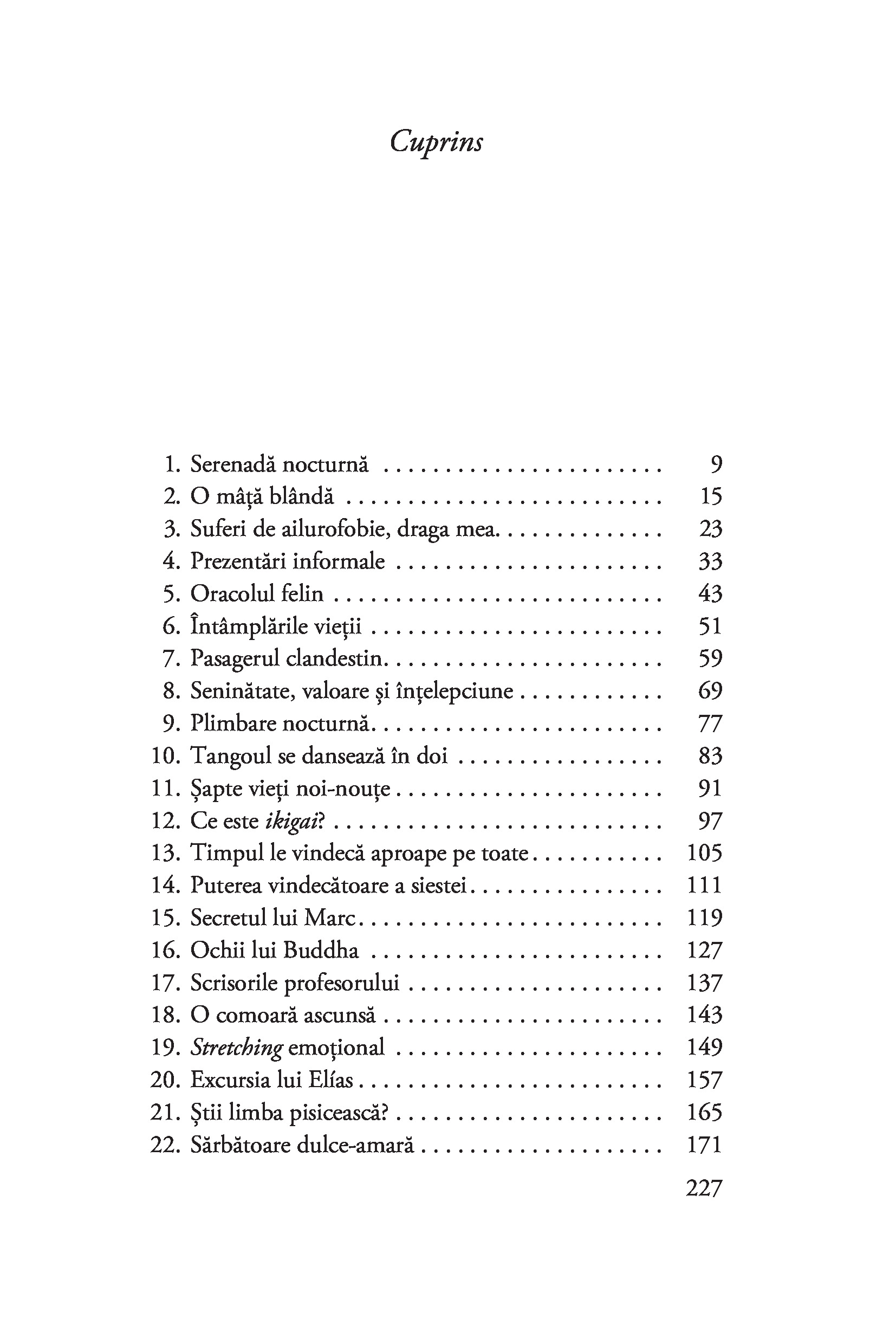 Răspunsul perfect îl dă Anna Sólyom în acest roman care ne invită în universul celor mai răsfățate feline de pe lume: pisicile. Sau „copiii“, cum le spune Yumi, proprietara japoneză a cafenelei, unde clienții cei mai de seamă sunt șapte pisici frumoase, mofturoase, muzicale,