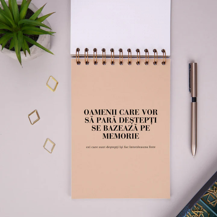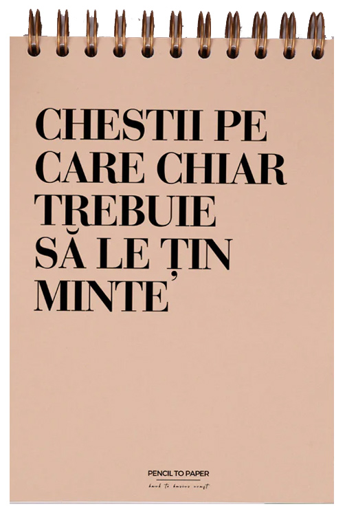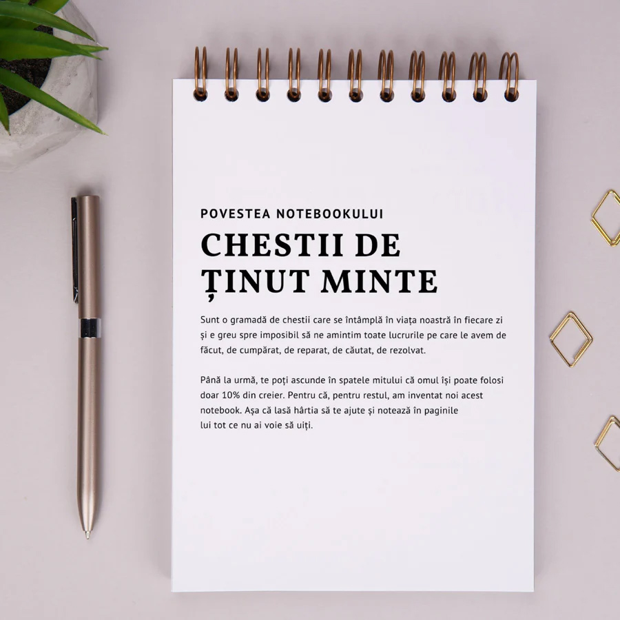 Notebook-ul cadou pentru prieteni "Chestii de tinut minte" e un cadou special pentru prietenii carora li se intampla mereu o gramada de chestii in fiecare zi si de care le e greu spre imposibil sa isi aminteasca de toate. Acest notebook e un cadou de ziua de nastere a prietenului tau, care il va ajuta sa tina pasul cu ce are de facut, de cumparat, de reparat, de cautat, de rezolvat. Pana la urma, omul isi poate folosi doar 10% din creier. Pentru restul, am inventat acest notebook. E un cadou potrivit si penru colegii de birou, de ziua lor sau de Craciun.