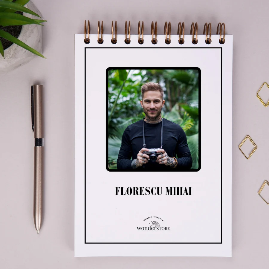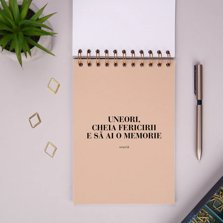 Notebook-ul are coperta spate din carton rigid, ca sa poti scrie pe el oriunde te-ai afla. La interior, are 80 de file imprimate cu puncte pentru scriere si trei despartitoare din acelasi carton premium ca si coperta fata. Fiecare despartitor este imprimat cu citate amuzante. Notebook-ul este legat cu spirala aramie din metal. Prima pagina a notebook-ului se poate personaliza cu o fotografie si un nume.