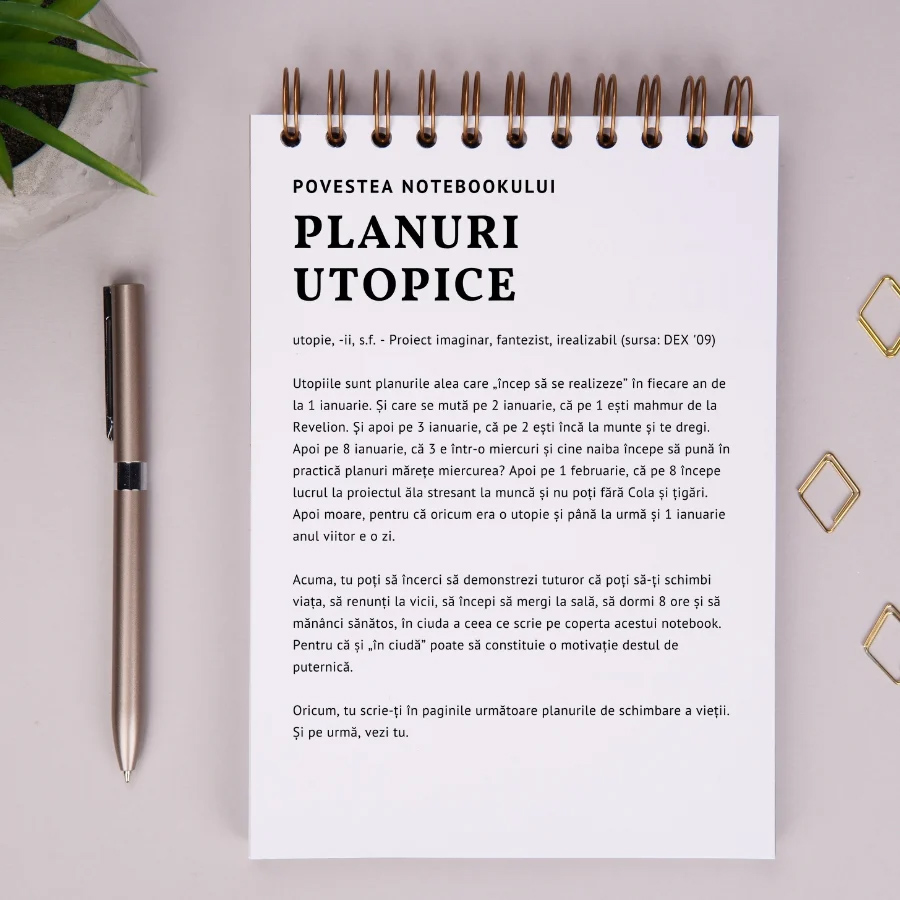 "Planuri utopice" este un cadou perfect pentru prietenii tai care fac in fiecare an o schimbare majora in viata lor. Sau asa zic ei. Ca de la 1 ianuarie. Prima zi din ianuarie a fiecarui an e insa, in mod invariabil, locul unde toate planurile se duc sa moara. Ceea ne nu ne impiedica sa le facem din nou, la anul. Pentru toate planurile astea, am creat acest notebook. Cercetatorii britanici zic ca daca scrii un plan pe hartie, sansele sa-l duci pana la capat cresc cu cateva procente. :)