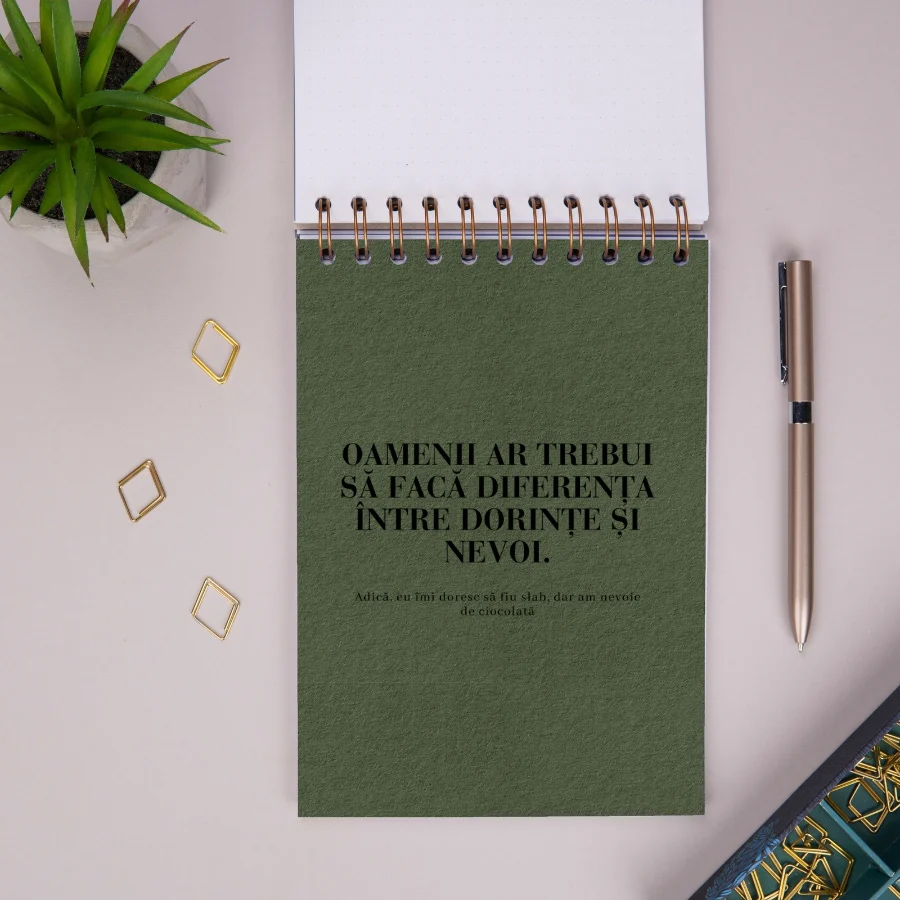 Notebook-ul are coperta spate din carton rigid, ca sa poti scrie pe el oriunde te-ai afla. La interior, are 80 de file imprimate cu puncte pentru scriere si trei despartitoare din acelasi carton premium ca si coperta fata. Fiecare despartitor este imprimat cu citate amuzante. Notebook-ul este legat cu spirala aramie din metal. Prima pagina a notebook-ului se poate personaliza cu o fotografie si un nume.