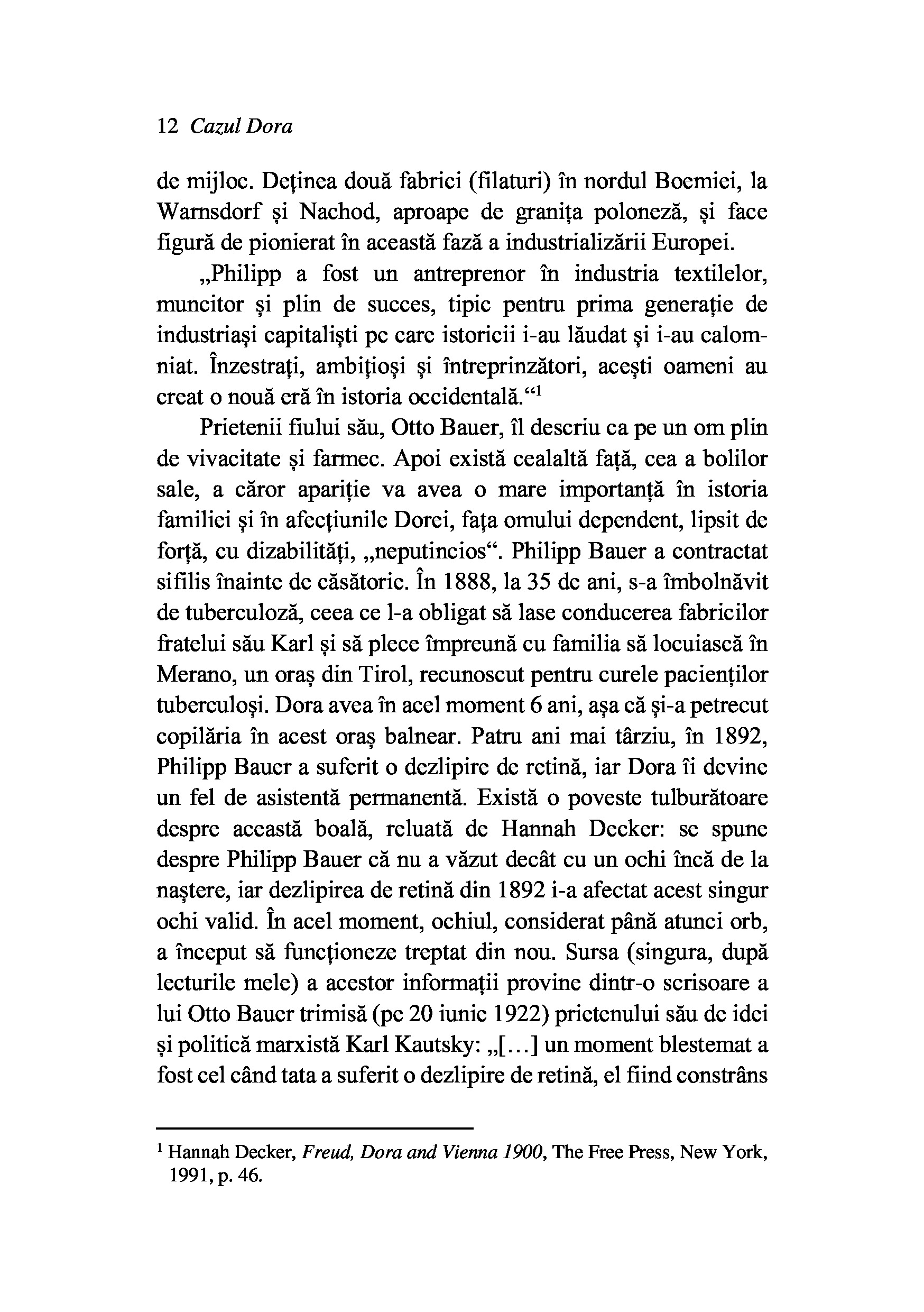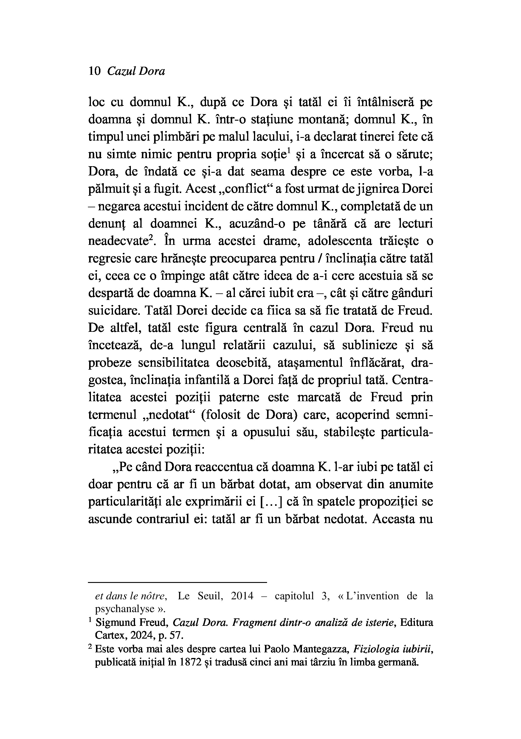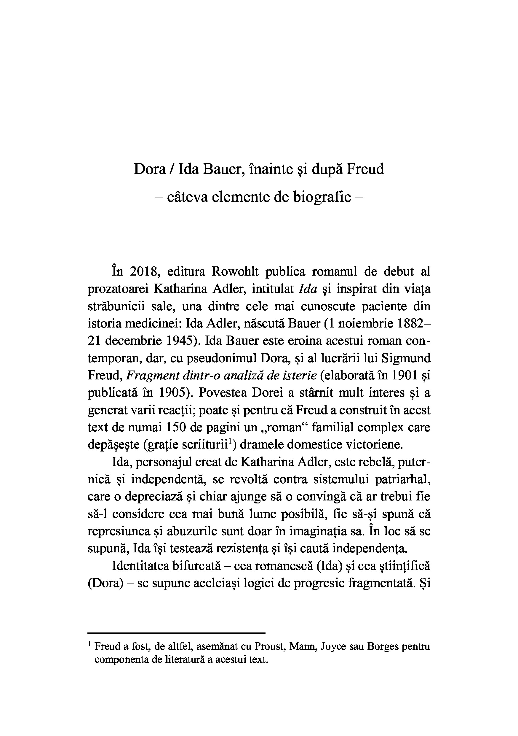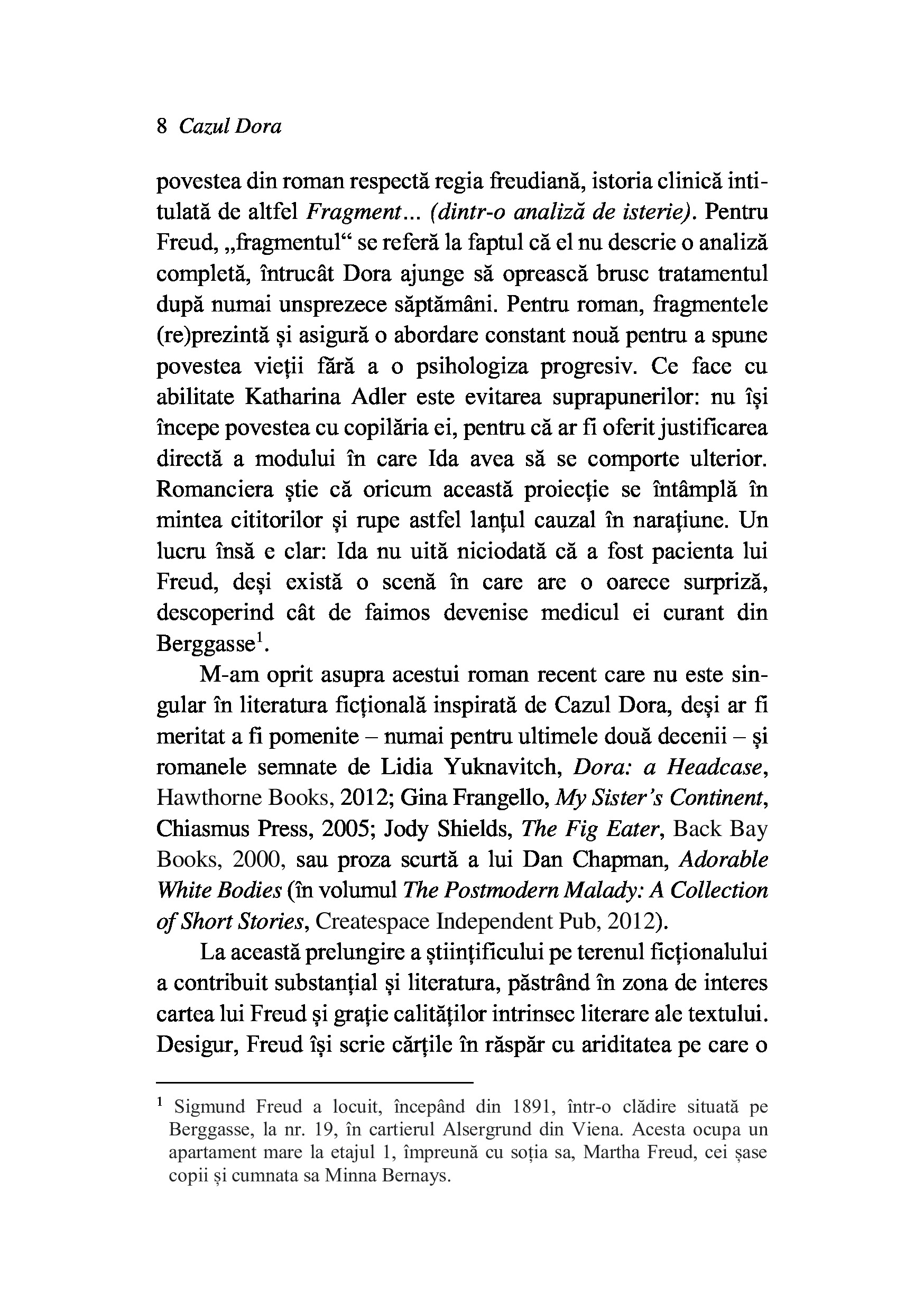 In cabinetul sau din Viena, Sigmund Freud primeste vizita Dorei, o tanara de 18 ani, trimisa de tata, cu speranta ca se va vindeca de fanteziile sexuale si de tentatia lecturilor licentioase. Dupa unsprezece saptamani, cand pacienta intrerupe voluntar tratamentul, o poveste de familie de la inceputul secolului trecut se transforma treptat intr-un text surprinzator despre iubire, boala, abuz.