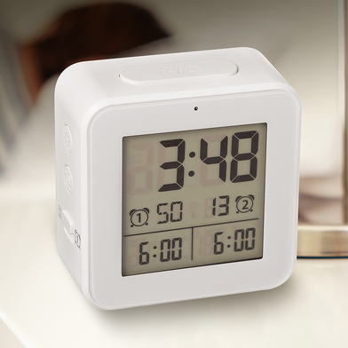 Ceas cu 2 alarme independente. Se ajusteaza automat in functie de lumina. Include si zilele saptamanii in limba engelza, termometru si hygrometru.