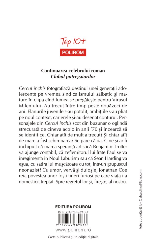 Cercul închis fotografiază destinul unei generaţii adolescente pe vremea sindicalismului sălbatic şi mature în clipa când lumea se pregăteşte pentru Virusul Mileniului. Au trecut între timp peste douăzeci de ani. Elanurile juvenile s-au potolit, ambiţiile s-au pliat pe noul context, carierele şi-au desenat conturul. Personajele din Cercul închis scot din buzunar o oglindă strecurată de cineva acolo în anii ’70 şi încearcă să se identifice. Chiar atât de mult a trecut? Şi chiar atât de mare a fost schimbarea? Se pare că da. Cine şi-ar fi închipuit că marea speranţă artistică Benjamin Trotter va ajunge contabil, că zeflemitorul lui frate Paul se va înregimenta în Noul Laburism sau că Sean Harding va eşua, cu satira lui muşcătoare cu tot, într-un grupuscul neonazist? Cu umor, vervă şi duioşie, Jonathan Coe reia povestea unor foşti tineri furioşi pe care viaţa i-a domesticit treptat. Spre regretul lor şi, fireşte, al nostru.