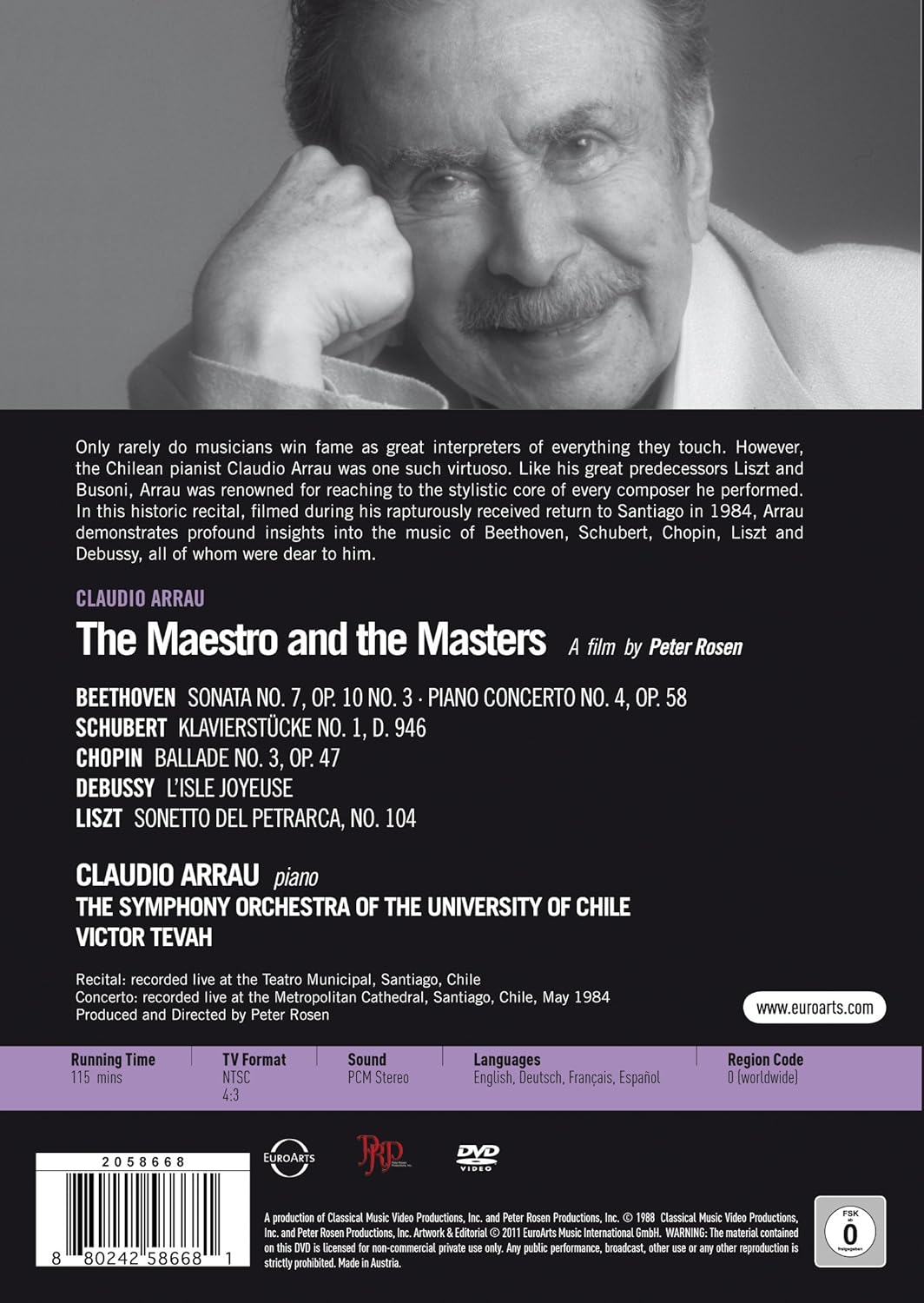 Third part of the successful 4-part Signature Performance Series. Only rarely do musicians win fame as great interpreters of everything they touch. However, the Chilean pianist Claudio Arrau was one such virtuoso. Like his great predecessors Liszt and Busoni, Arrau was renowned for reaching to the stylistic core of every composer he performed. In this historic recital, filmed during his rapturously received return to Santiago in 1984, Arrau demonstrates profound insights into the music of Beethoven, Schubert, Chopin, Liszt and Debussy, all of whom were dear to him.
