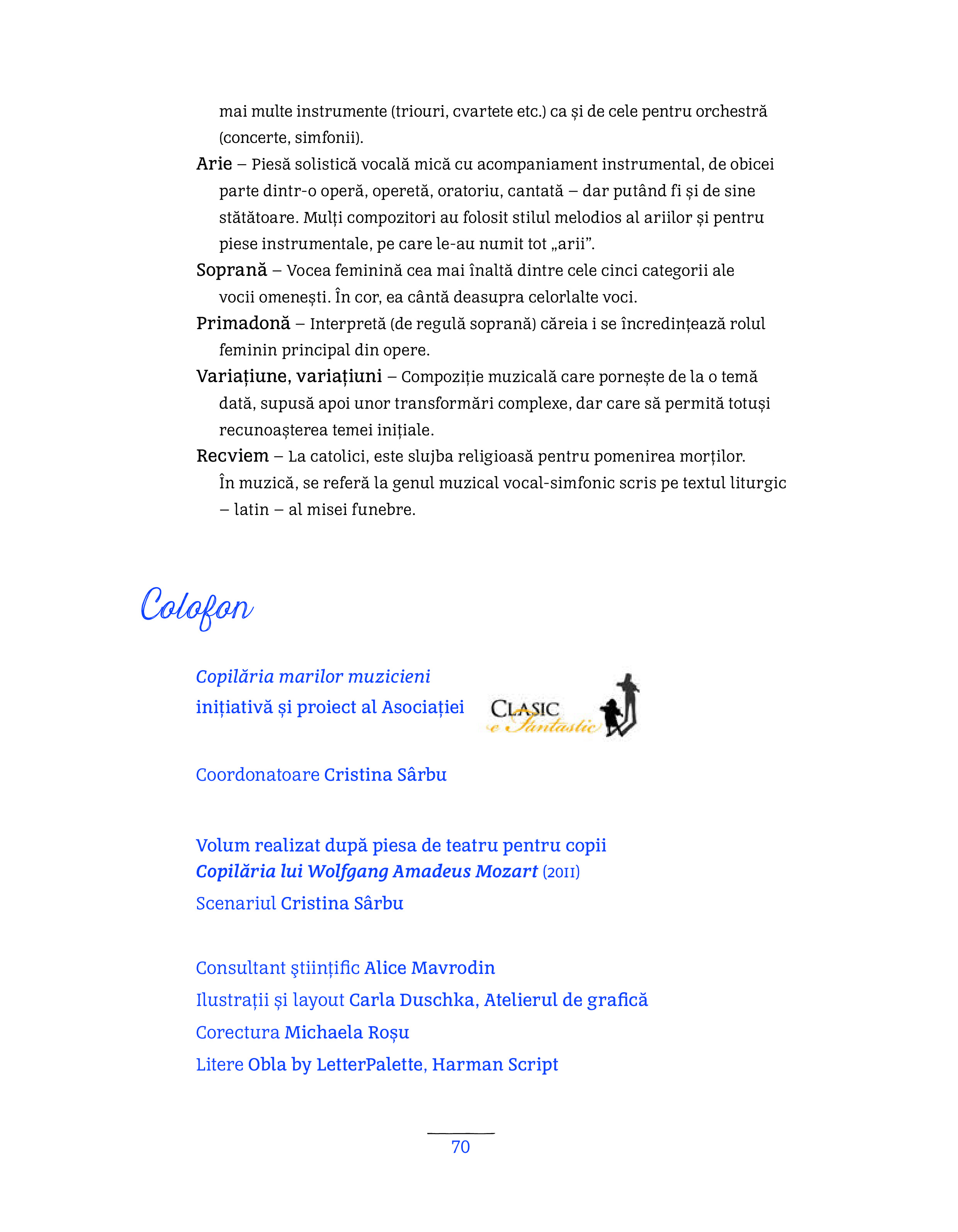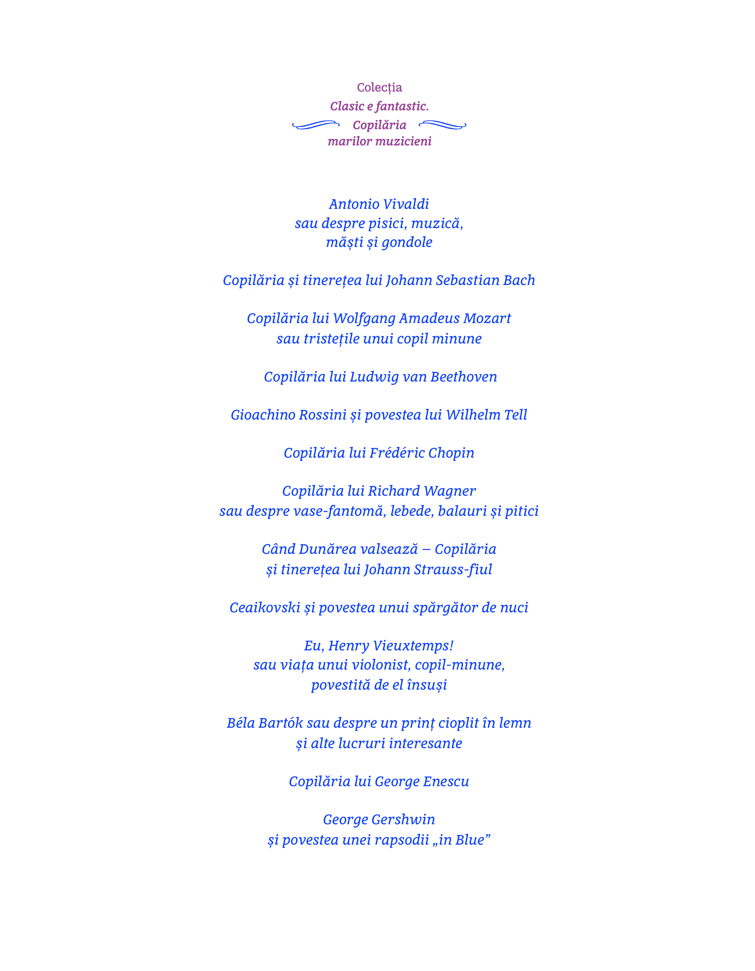 Adresate copiilor de toate vârstele, colecţia „Clasic e fantastic“ conţine povestiri despre copilăriile marilor compozitori, despre bucuriile și tristeţile lor, despre munca de zi cu zi în faţa instrumentului, începând de la vârste foarte mici, despre călătoriile prin întreaga Europă, și mai ales despre felul în care toţi au învăţat să scrie muzică și să se bucure de ea.
