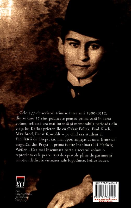 Cele 377 de scrisori trimise intre anii 1900-1912, dintre care 15 sint publicate pentru prima oara in acest volum, reflecta cea mai intensa si memorabila perioada din vaita lui Kafka: prieteniile cu Oskar Pllak, Paul Kisch, Max Brod, Ernst Rowohlt - pe cand era student al faculatatii de Drept, iar, mai apoi, angajat al unei firme de asigurari din Praga -, prima iubire inchinata lui Hedwig Weiler... Cea mai insemnata parte a acestui volum o reprezinta cele peste 100 de epistole pline de pasiune si emotie, dedicate viitoarei sale logodnice, Felice Bauer.