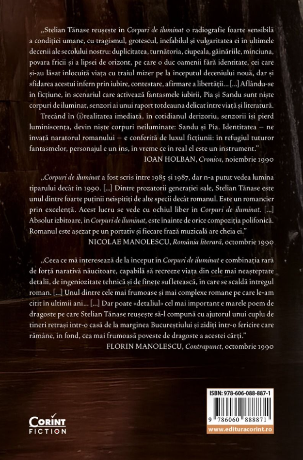 „Corpuri de iluminat a fost scris între 1985 și 1987, dar n-a putut vedea lumina tiparului decât în 1990. [...] Dintre prozatorii generației sale, Stelian Tănase este unul dintre foarte puținii neispitiți de alte specii decât romanul. Este un romancier prin excelență. Acest lucru se vede cu ochiul liber în Corpuri de iluminat. Se știe, de la Bahtin, că principala însușire a romanului este caracterul lui polifonic. Cine n-are ureche pentru toate vocile lumii poate fi un extraordinar povestitor, dar nu izbutește în roman. [...] Absolut izbitoare, în Corpuri de iluminat, este înainte de orice compoziția polifonică. Romanul este așezat pe un portativ și fiecare frază muzicală are cheia ei. Scriitura narativă este multiplă: coerentă, obiectivă, telegrafică, «internalizată» psihologic, diagonală, în stilul indirect liber etc. Fiecare capitol are perspectiva lui morală: emfatică, parodică, glumeață, neutră. Evenimentele sunt prezentate ca tragice sau vodevilești. Unele pagini sunt relatate în maniera eseului, altele în aceea a prozei ritmate și rimate. Planul personajelor se reflectă în acela auctorial. Și – ceea ce este esențial – diversitatea textuală nu e arbitrară, ci corespunde unei realități substanțiale de apreciere a ființei umane și a raporturilor ei cu lucrurile.“