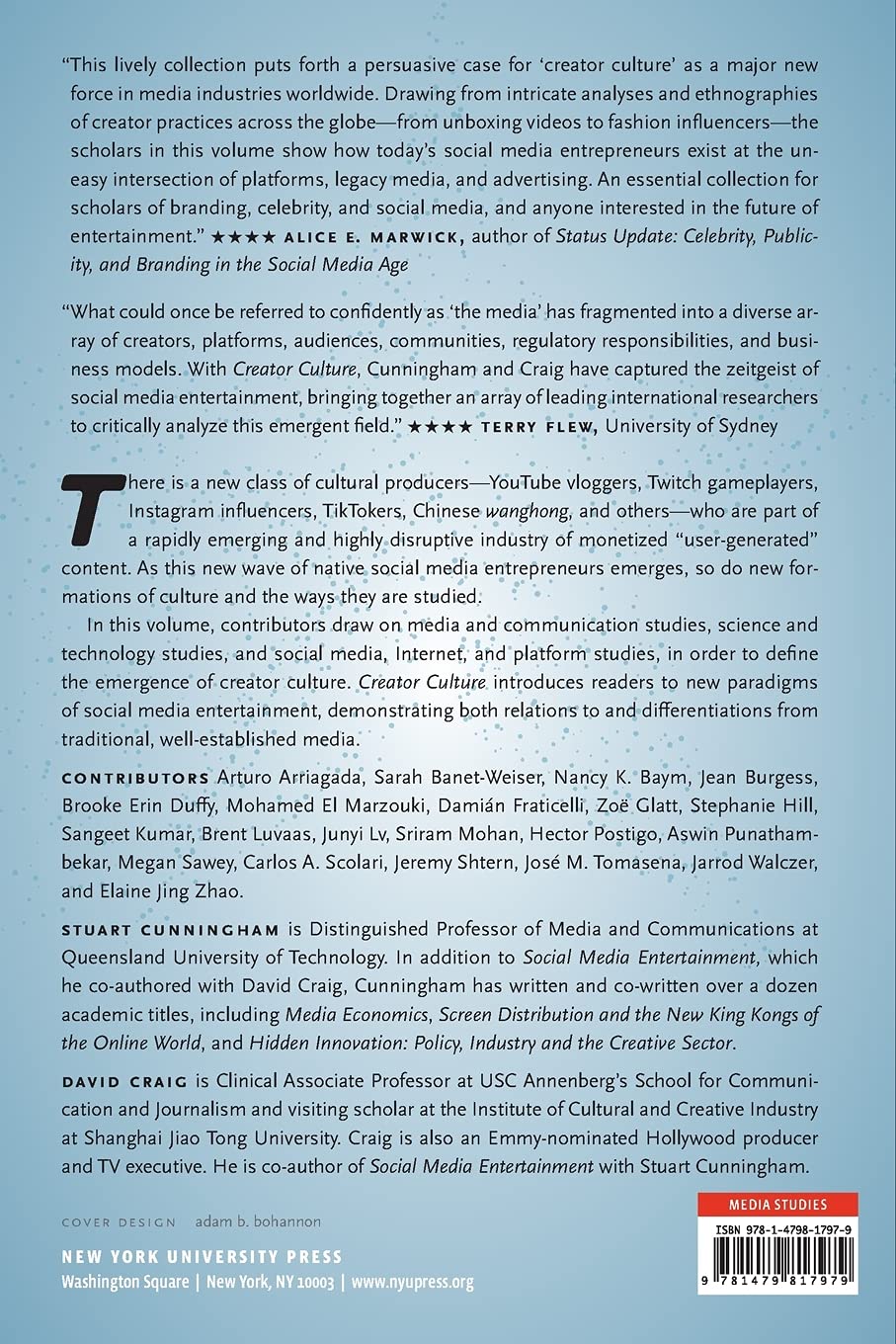Contributors include: Jean Burgess, Zoë Glatt, Sarah Banet-Weiser, Brent Luvaas, Carlos A. Scolari, Damián Fraticelli, José M. Tomasena, Junyi Lv, Hector Postigo, Brooke Erin Duffy, Megan Sawey, Jarrod Walzcer, Sangeet Kumar, Sriram Mohan, Aswin Punathambekar, Mohamed El Marzouki, Elaine Jing Zhao, Arturo Arriagada, Jeremy Shtern, Stephanie Hill