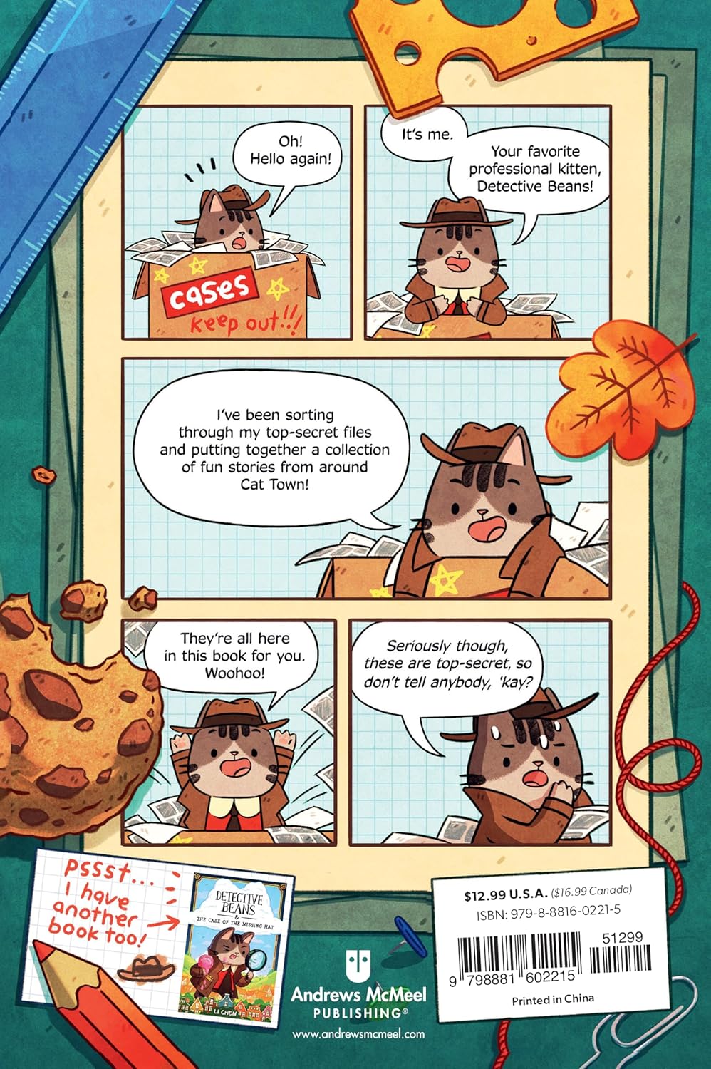 Detective Beans is back on the case! In this series of mysteries and adventures, the world's cutest cat detective comes to the aid of her fellow villagers, searching for a cookie thief (with surprising results!), aiding a deceptive duck in the recovery of lost goods, and even doing his best to help a confused bear prove that the moon is made of cheese.