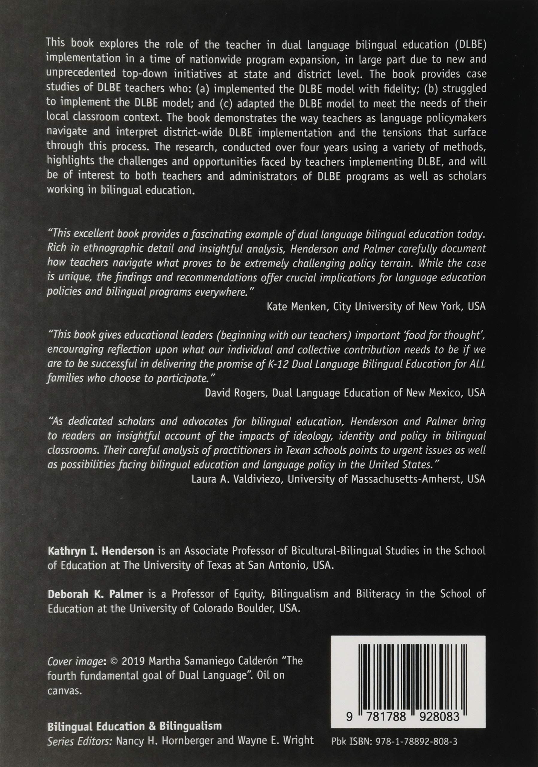 This book explores the role of the teacher in dual language bilingual education (DLBE) implementation in a time of nationwide program expansion, in large part due to new and unprecedented top-down initiatives at state and district level. The book provides case studies of DLBE teachers who: (a) implemented the DLBE model with fidelity; (b) struggled to implement the DLBE model; and (c) adapted the DLBE model to meet the needs of their local classroom context. The book demonstrates the way teachers as language policymakers navigate and interpret district-wide DLBE implementation and the tensions that surface through this process. The research, conducted over 4 years using a variety of methods, highlights the challenges and opportunities faced by teachers implementing DLBE, and will be of interest to both teachers and administrators of DLBE programs as well as scholars working on bilingual education.