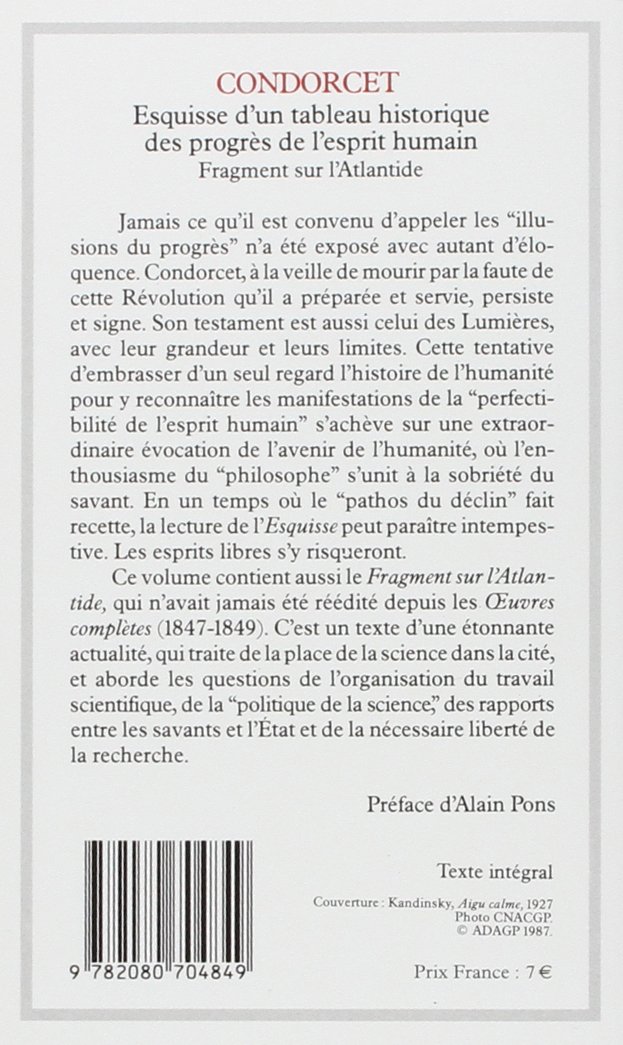 Cette tentative d'embrasser d'un seul regard l'histoire de l'humanité pour y reconnaître les manifestations de la " perfectibilité de l'esprit humain " s'achève sur une extraordinaire évocation de l'avenir de l'humanité, où l'enthousiasme du " philosophe " s'unit à la sobriété du savant.