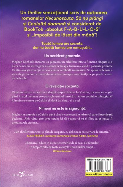 „Un thriller întunecat și plin de suspans, cu delicioase răsturnări de situație.” ALICE FEENEY, autoarea romanului Piatră, hârtie, foarfecă