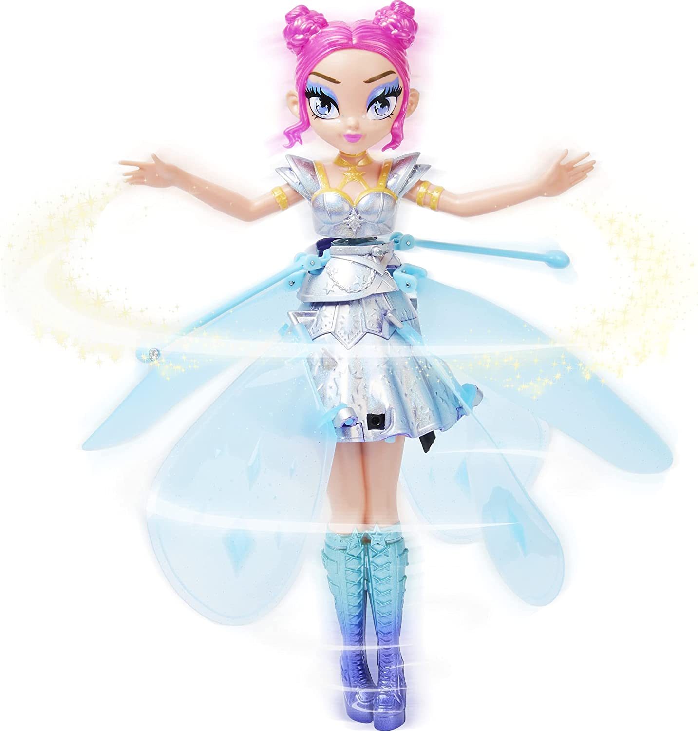 Zâna Starlight Idol, cu ținuta ei magică albastră și părul roz îi va încânta pe copii! După ce o scoateți din oul transparent, albastru sclipitor, așezați-o pe baza sa de lansare, pentru a o face să lumineze, să zboare și să se invârtă, precum o zână adevărată.