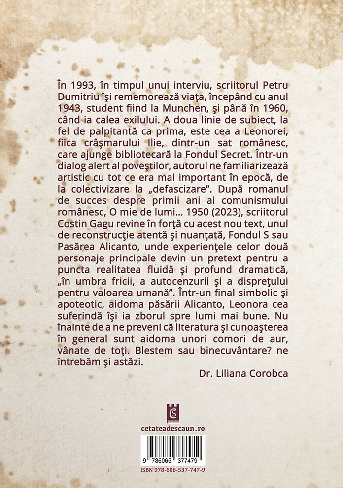 În 1993, în timpul unui interviu, scriitorul Petru Dumitriu își rememorează viața, începând cu anul 1943, student fiind la Munchen, și până în 1960, când ia calea exilului. A doua linie de subiect, la fel de palpitantă ca prima, este cea a Leonorei, fiica crâșmarului Ilie, dintr-un sat românesc, care ajunge bibliotecară la Fondul Secret. Într-un dialog alert al poveștilor, autorul ne familiarizează artistic cu tot ce era mai important în epocă, de la colectivizare la „defascizare”. După romanul de succes despre primii ani ai comunismului românesc, O mie de lumi… 1950 (2023), scriitorul Costin Gagu revine în forță cu acest nou text, unul de reconstrucție atentă și nuanțată, Fondul S sau Pasărea Alicanto, unde experiențele celor două personaje principale devin un pretext pentru a puncta realitatea fluidă și profund dramatică, „în umbra fricii, a autocenzurii și a disprețului pentru valoarea umană”. Într-un final simbolic și apoteotic, aidoma păsării Alicanto, Leonora cea suferindă își ia zborul spre lumi mai bune. Nu înainte de a ne preveni că literatura și cunoașterea în general sunt aidoma unori comori de aur, vânate de toți. Blestem sau binecuvântare? ne întrebăm și astăzi.
