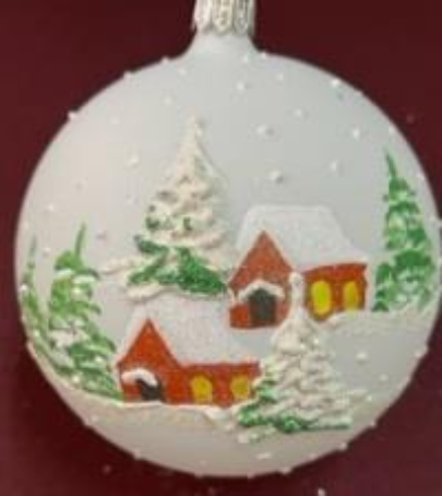 Glob din sticlă pictat manual, produs în România. Globul este ambalat într-o cutie cu fereastră.