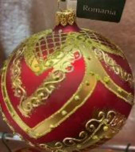 Glob din sticlă pictat manual, produs în România. Globul este ambalat într-o cutie cu fereastră.