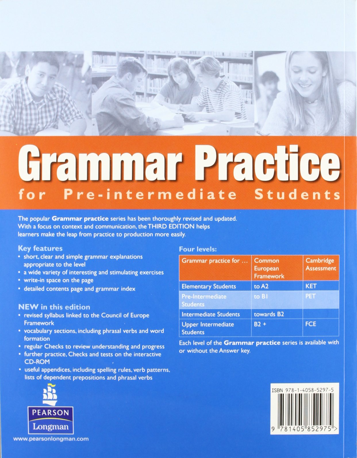 Today's students and teachers want a grammar book that helps the learner make the leap from practice to production. With 100% new content across all four levels, 'Grammar Practice for .' (3rd edition) meets this need.