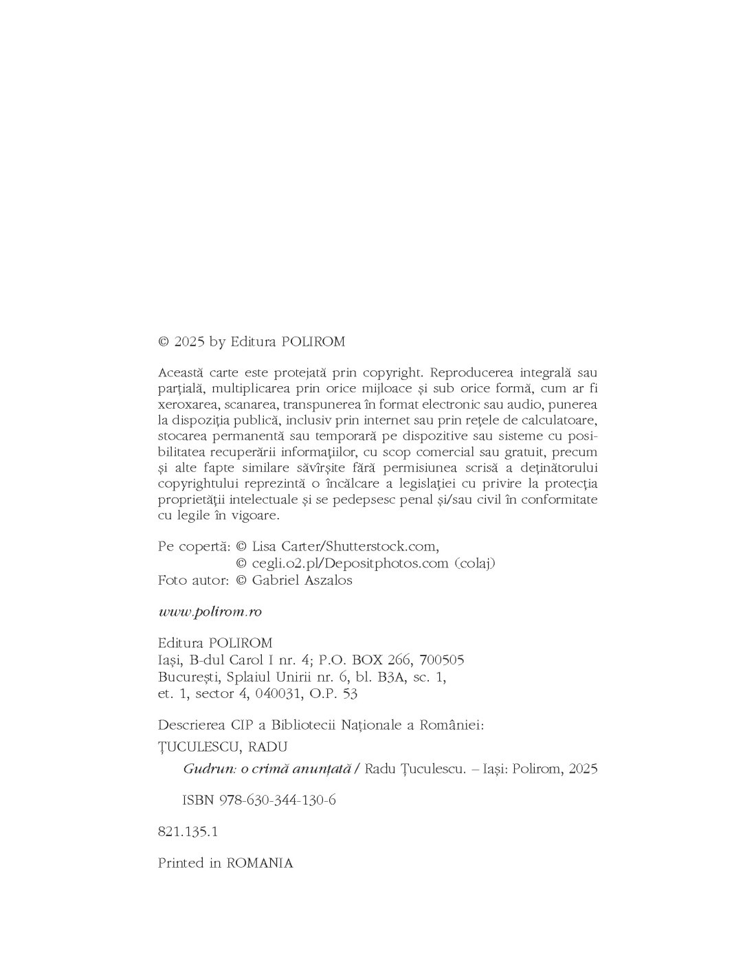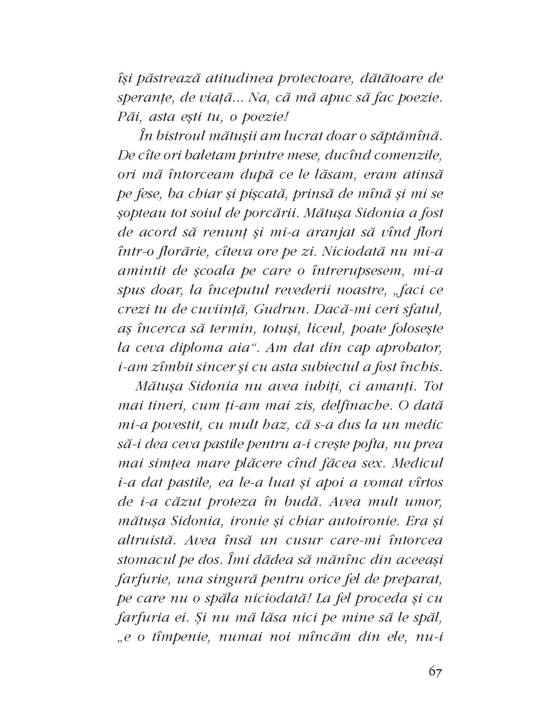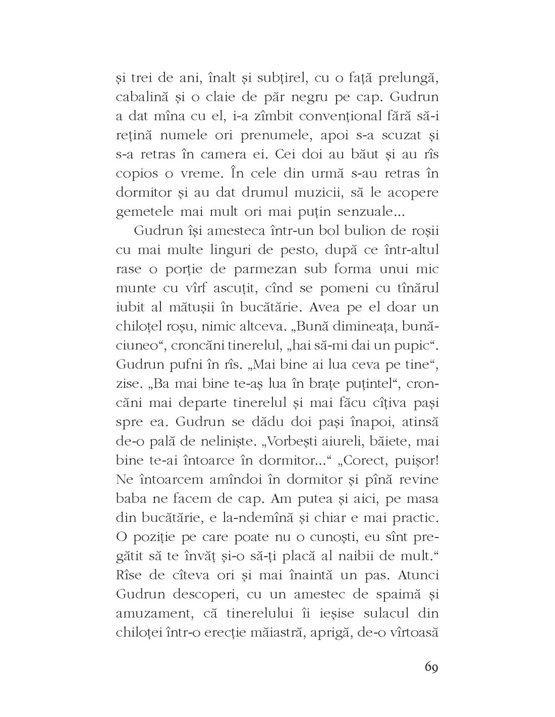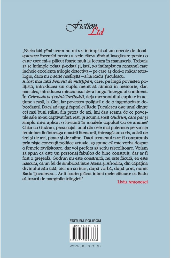 Voiam să spun că este un personaj fabulos de bine construit, dar ar fi fost o greșeală. Gudrun nu este construită, nu este făcută, ea este născută, ca un fel de simbioză între Atena și Afrodita, din căpățâna divinului său tată, aici un scriitor, după vorbă, după port, numit Radu Țuculescu... Ar fi foarte plăcut inimii mele cititoare ca Radu să treacă de marginile trilogiei!”
