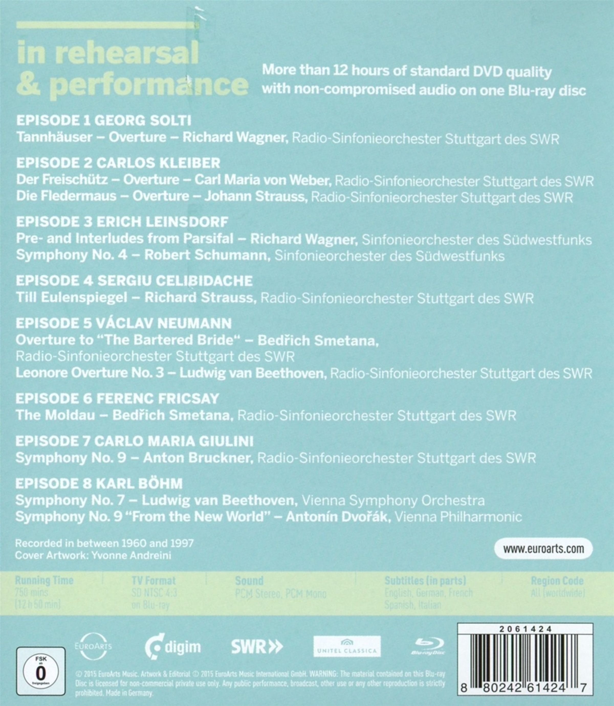 The camera accompanies world-class conductors such as Carlos Kleiber, Ferenc Fricsay and Georg Solti as they rehearse a work by Beethoven, Smetana or Dvorák - and then into the performance of said work. In this way, the release offers viewers the unique opportunity to experience and compare conductors as they stand before the orchestra. And it offers the opportunity to witness how a work changes over time as a conductor shapes and forms it in rehearsal - until it sounds exactly as he or she wants it to for the concert. Recorded between 1960 and 1997.