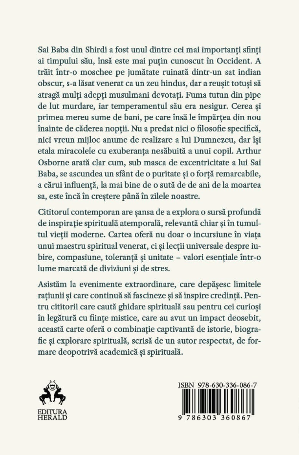 Acest volum exploreaza invataturile profunde si transformatoare ale lui Sai Baba din Shirdi, o figura spirituala remarcabila ale carui mesaje reflecta valori fundamentale precum pacea, modestia, generozitatea si integritatea.