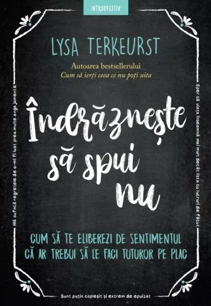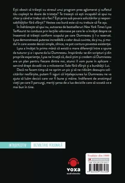 În Îndrăznește să spui nu, autoarea de bestselleruri New York Times Lysa TerKeurst te conduce prin lecțiile valoroase pe care le-a învățat despre ce înseamnă să trăiești conform scopului pe care Dumnezeu ți l-a rezervat. Lysa demonstrează puterea incredibilă a celor două cuvinte, da și nu, și modul în care aceste decizii simple, zilnice, ne pot contura povestea existenței.