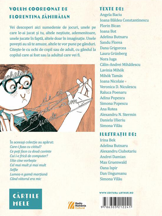 Vei descoperi aici sumedenie de jocuri, unele pe care le-ai jucat și tu, altele neştiute, ademenitoare, unele jucate în faptă, altele doar în imaginaţie. Unele poveşti au să te amuze, altele te vor pune pe gânduri. Citește-le cu ochi de copil sau de adult, cu gândul la copilul care ai fost sau la adultul care vei fi.