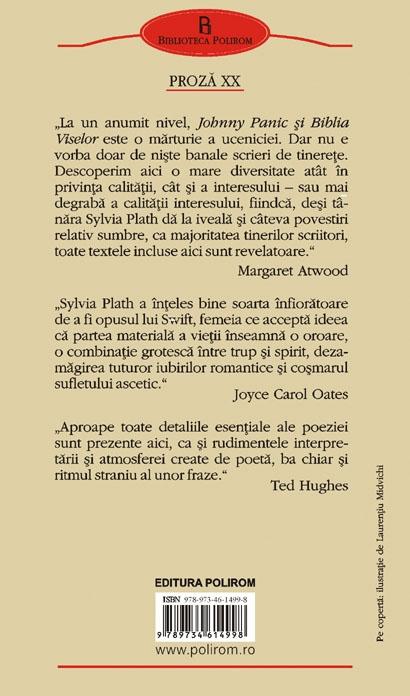 Volumul de proza Johnny Panic si Biblia Viselor (aparut intr-o prima editie in 1977, apoi reeditat si extins) include un corpus amplu de texte in proza, de la povestiri de tinerete si maturitate pina la fragmente din jurnalele si insemnarile personale ale autoarei. Astfel, cititorul poate descoperi tainele atelierului de creatie al Sylviei Plath, modul in care o istorie personala se fictionalizeaza, devenind literatura pura. In plus, textele din volum dau adevarata masura a scriitoarei : rafinata si directa, cruda si sensibila, intelegatoare si ironica, Sylvia Plath e, intr-adevar, o artista proteica.