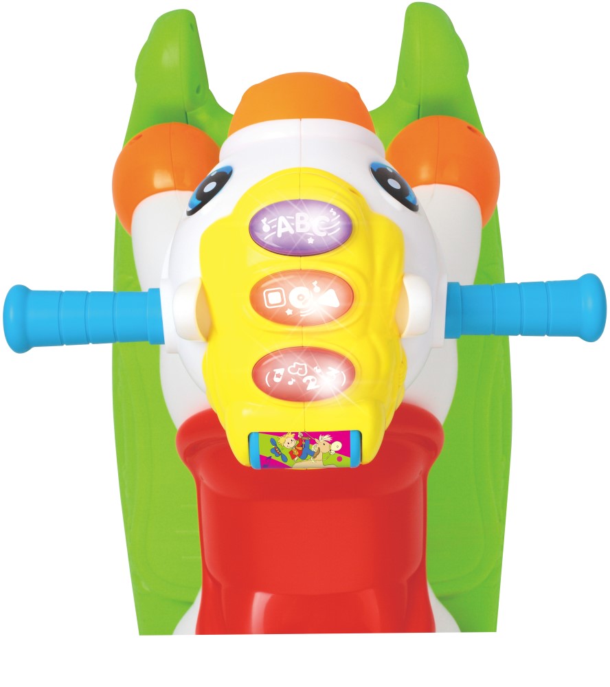 copilul trebuie sa se miste in fata si in spate cu ajutorul taliei si membrelor, fapt care imbunatateste simtul de echilibru, muschii de la maini, abilitatea de a strange si dezvoltarea creierului; in timpul balansarii si alunecarii copilul va invata sa se tina cat mai bine pentru a se proteja de o eventuala cadere, dezvoltandu-si abilitatea de a strange; apasati pe butoane pentru a invata alfabetul si a asculta muzica. Copilul va fi stimulat sa se legene in ritmul muzicii si sa-si dezvolte capacitatea fizica; apasati butoanele cu forme geometrice pentru a le invata si a-si dezvolta cunoasterea si cunostintile; apasati butoanele cu numere pentru a le invata si a-i dezvolta cunoasterea matematica a copilului. rotiti pentru a auzi sunete de caluti si galop, pentru a-i stimula curiozitatea si dorinta de explorare; spatiul pentru depozitare de sub sa, poate fi folosit pentru a tine jucarii si a-i pune mancarea atunci cand copilul este scos afara; functia de balansare si alunecare ajuta la dezvoltarea capacitatilor motorii, pentru a-i imbunatati echilibrul, coordonarea corpului si dezvoltarea fizicului.