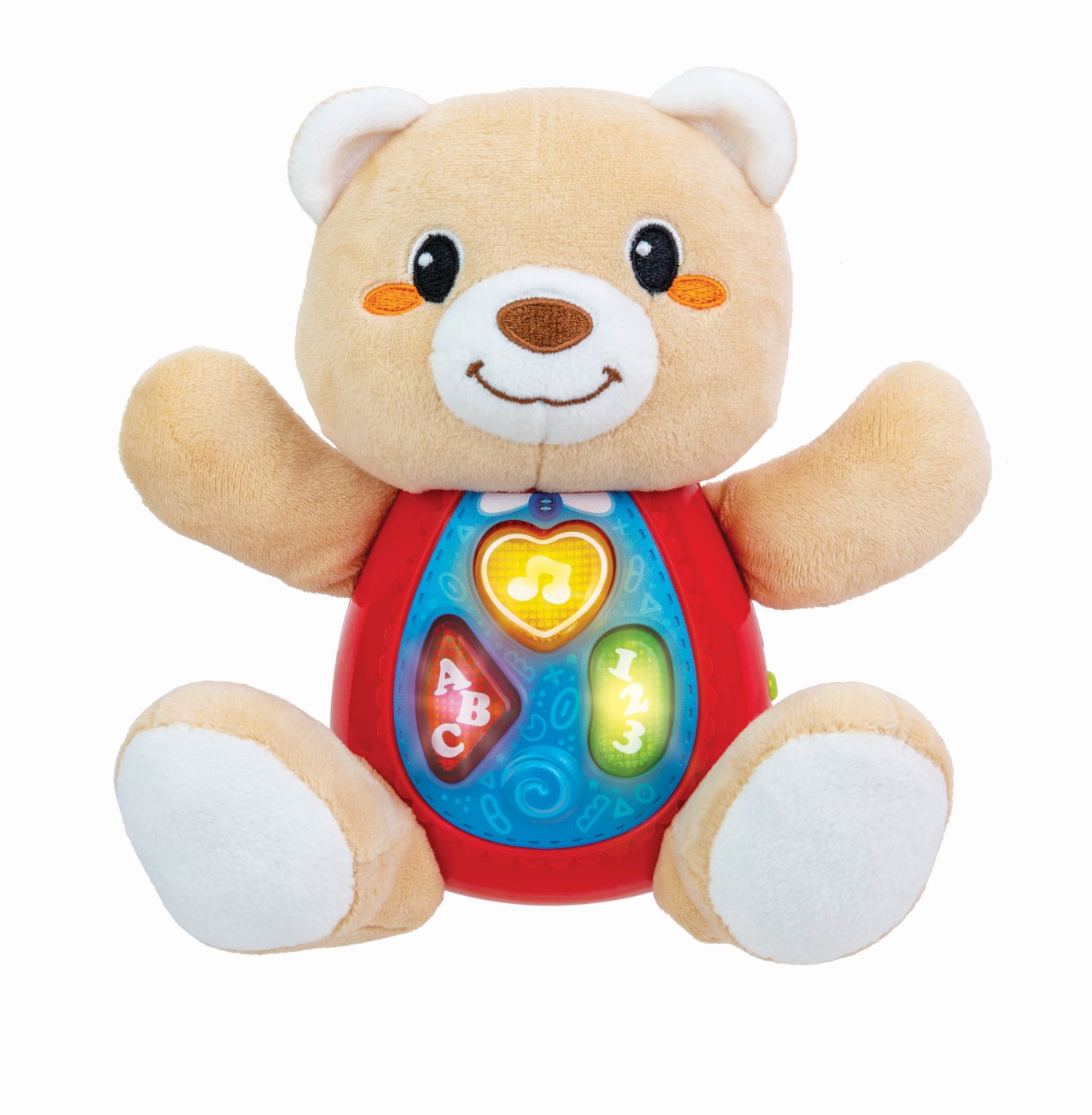 Ursuletul este echipat cu trei butoane luminoase care capteaza imediat atentia copiilor. Aceste butoane nu doar stralucesc, ci si activeaza fraze cu rime si invatare simpla. Pe langa frazele cu rime, ursuletul include si o varietate de melodii distractive si vesele. Ursuletul este conceput pentru a fi usor de manevrat de catre cei mici. Butoanele luminoase sunt mari si usor de apasat, incurajand coordonarea mana-ochi si dezvoltarea abilitatilor motorii fine. Cand copiii apasa pe butoane, sunt recompensati cu lumini, sunete si fraze, incurajand explorarea si invatarea prin joc. In plus, ursuletul este durabil si rezistent, fiind construit pentru a face fata entuziasmului si energiei copiilor mici. Culorile vii si designul atractiv sunt menite sa atraga atentia si sa mentina interesul celor mici pentru perioade lungi de timp.