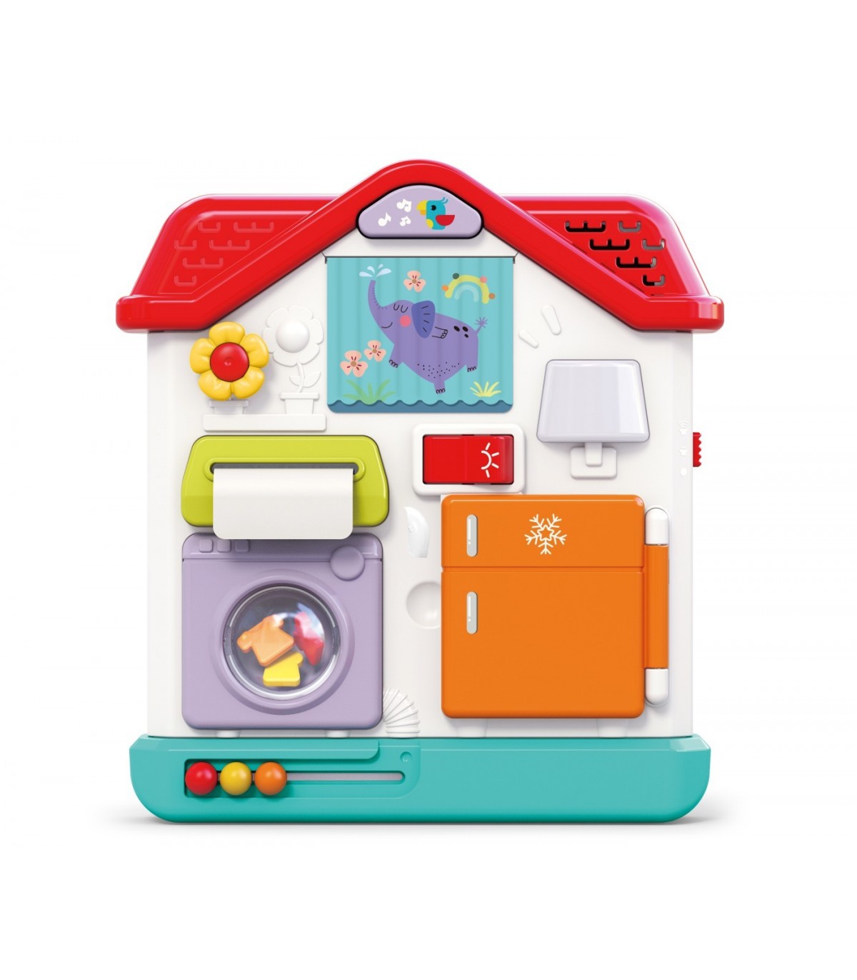 Casuta de jucarie cu activitati senzoriale Montessori. Jucariile Montessori sunt concepute pentru a incuraja invatarea prin joc si pentru a stimula abilitatile de manipulare, observatia si imaginatia copilului. Aceste abilitati sunt importante pentru invatarea practica si dezvoltarea copiilor. Apasati butonul de muzica pentru a asculta cele 8 melodii. Efecte sonore amuzante vor fi adaugate melodiilor atunci cand apasati pe masina de spalat, sticla de lapte sau cutia de servetele.