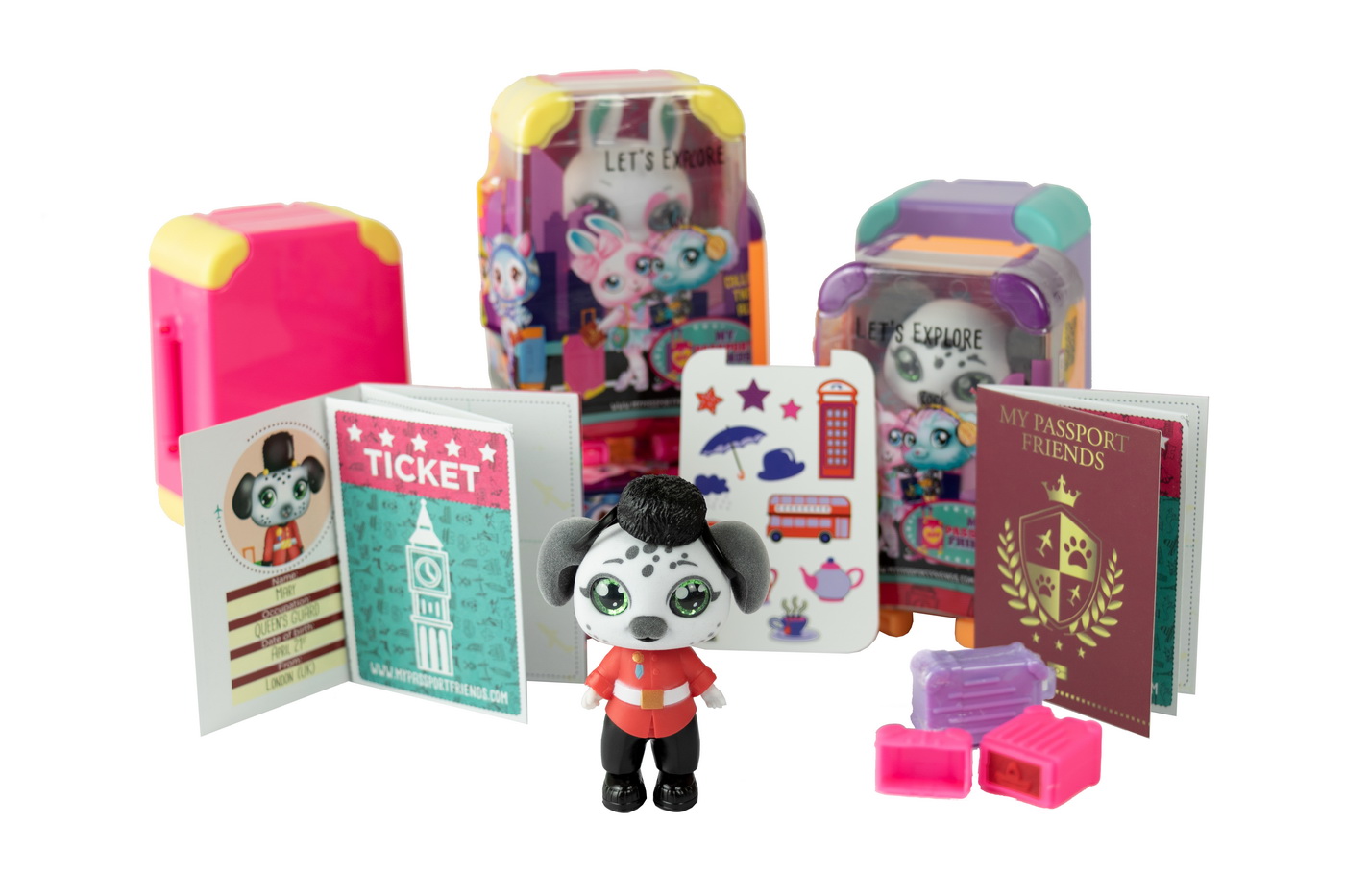 Linia de jucarii are o multime de prieteni draguti cu animale, cu un stil unic si accesorii personalizate, disponibile in trei pachete de carucioare exclusive. Lansarea initiala include 12 caractere care vor fi urmate de caractere noi in versiunile ulterioare. Prietenii mei din pasaport sunt prietenii vostri de colectie minunati si eleganti! Traind din valizele si pasapoartele lor la moda, sunt gata sa exploreze lumea! Fiecare prieten unic vine cu o tinuta eleganta interschimbabila, autocolante unice pentru a-si personaliza valiza si stampile pentru a-si umple pasaportul! O pagina dedicata pentru fiecare personaj cu multe continuturi descoperi totul despre el / ea: imagini, video, carte de identitate, fisa informativa, marci majore ale orasului, invata limba personajului, activitati de colorat si DIY. De asemenea, My Passport Friends are o aplicatie dedicata pentru descarcare gratuita cu caracteristici de realitate augmentata: scanati figurina 3D pentru a aduce personaj viu! Fa-ti un selfie cu prietenul tau.