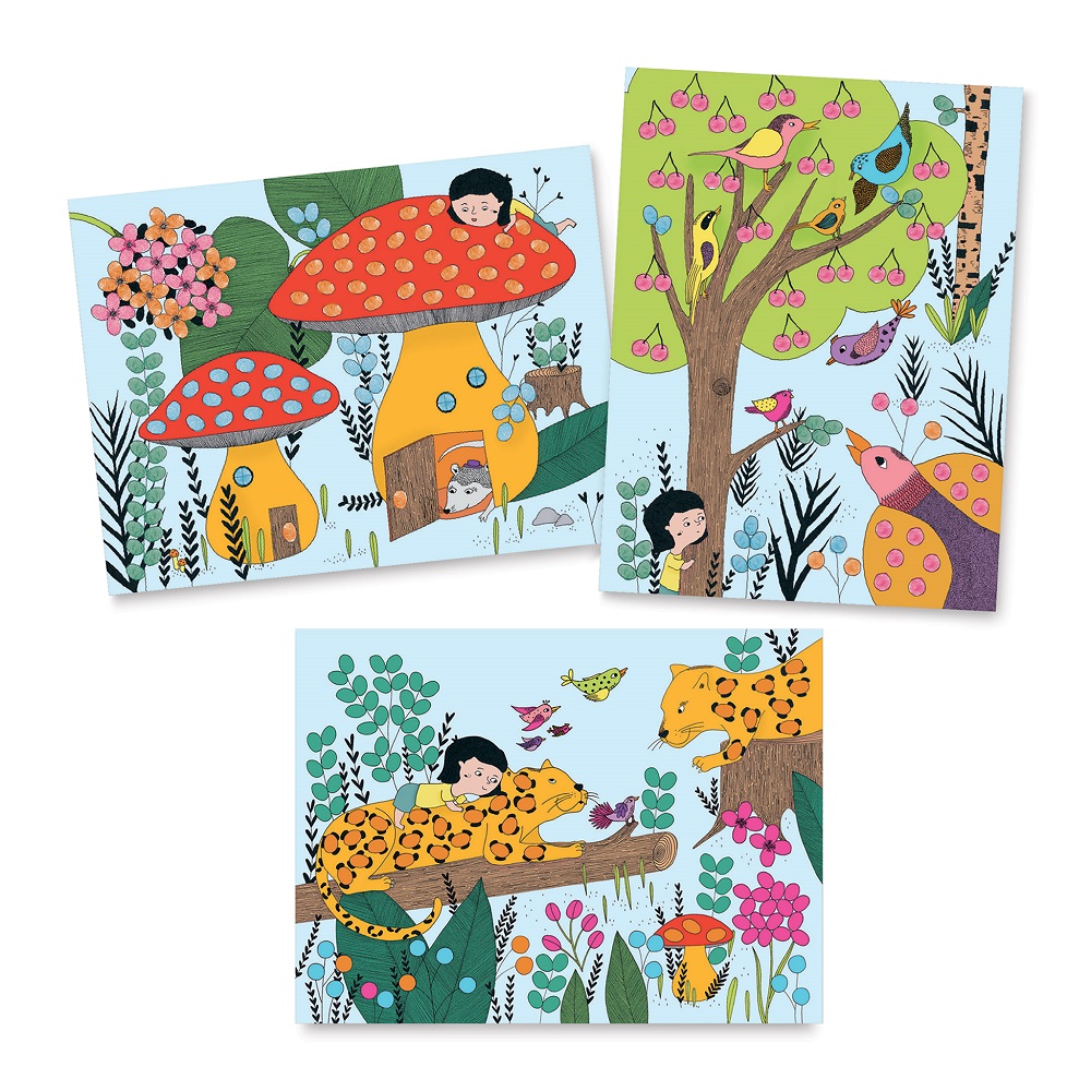 Kit creativ cu 4 planșe ilustrate de dimensiunea 21 x 28 cm, gata de colorat. Copiii vor atinge tușierele cu degetele pentru a picta planșele. Tușul este lavabil.