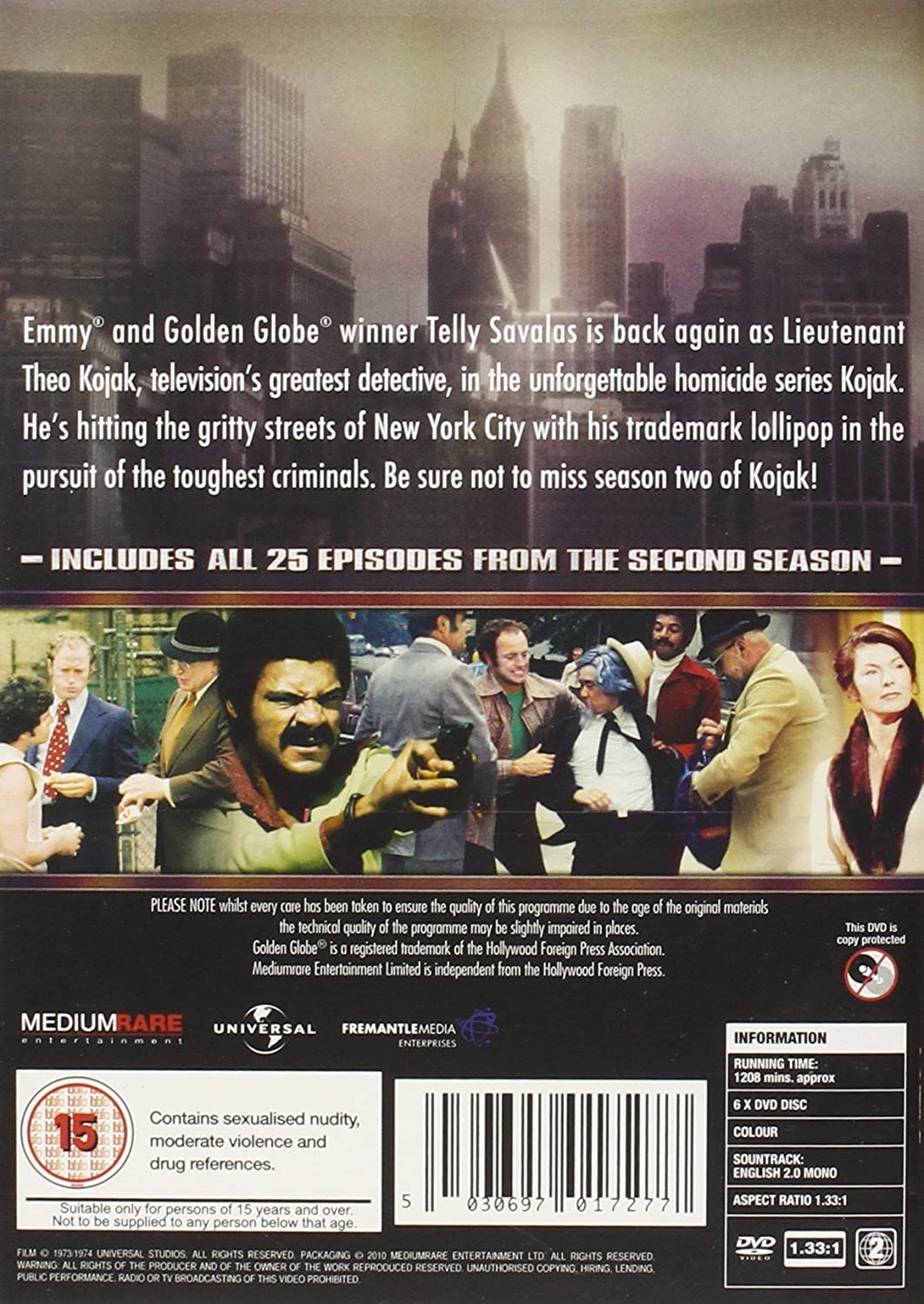 All 25 episodes from the second season of the hard-hitting American detective drama following the investigations of Kojak (Telly Savalas), the bald, no-nonsense cop who is never without a lollipop in his hand. Episodes are: 'The Chinatown Murders (Part 1)', 'The Chinatown Murders (Part 2)', 'Hush Now, Don't You Die', 'A Very Deadly Game', 'Wall Street Gunslinger', 'Slay Ride', 'Nursemaid', 'You Can't Tell a Hurt Man How to Holler', 'The Best Judge Money Can Buy', 'A Souvenir from Atlantic City', 'A Killing in the Second House', 'The Best War in Town', 'Cross Your Heart and Hope to Die', 'The Betrayal', 'Loser Takes All', 'Close Cover Before Killing', 'Acts of Desperate Men', 'Queen of the Gypsies', 'Night of the Piraeus', 'Elegy in an Asphalt Graveyard', 'The Goodluck Bomber', 'Unwanted Partners', 'Two-Four-Six for Two Hundred' and 'I Want to Report a Dream'.