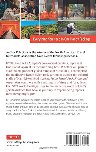 The only guide you'll need for getting around Kyoto & Nara. Everything you need is in this one convenient package including a large pull-out map! This brand new Japan travel guide by award-winning author Rob Goss, a longtime Japan resident, is designed for people with limited time. It covers not only the unique UNESCO World Heritage sites but also bustling Nishiki-koji street market and many smaller shrines and temples where enchanting moss and tree gardens lie hidden behind high stone walls. The list of things to do and see in Kyoto and Nara is literally endless, which is why you need an experienced author to point the way. Key features of this travel pack include: Kyoto and Nara's Best Sights highlights the top 11 things to see and do, from strolling the meditative grounds of Ginkaku-ji temple and contemplating the cryptic design of Ryoan-ji's Zen rock garden to exploring the bamboo grove in Arashiyama and enlivening the senses with a wander around Nishiki-koji food market. Exploring Kyoto and Nara takes you deep into the two former capitals with eight day-by-day guides, one day starting with a walk among the teahouses and geisha-houses of Gion and finishing in the sprawling grounds of Nijo Castle; other days taking in sights such as the gilded temple of Kinkaku-ji and the gardens of Daitoku-ji, or exploring the cluster of UNESCO World Heritage sites in Nara. Author's Recommendations gives specific details on the best hotels and restaurants; the most kid-friendly activities; the best night spots; the top shopping areas; the best museums and galleries; the best cultural experiences, and the best festivals. Travel Practicalities provides essential information to make your trip go smoothly, from useful Japanese phrases and websites to information on money, transportation, travel visas, and much more. Easy-to-use and easy to carry, Tuttle Travel Pack Kyoto & Nara is packed with invaluable information, detailed maps, great photography, and tips on how to make the most of your stay while avoiding all of the fuss.